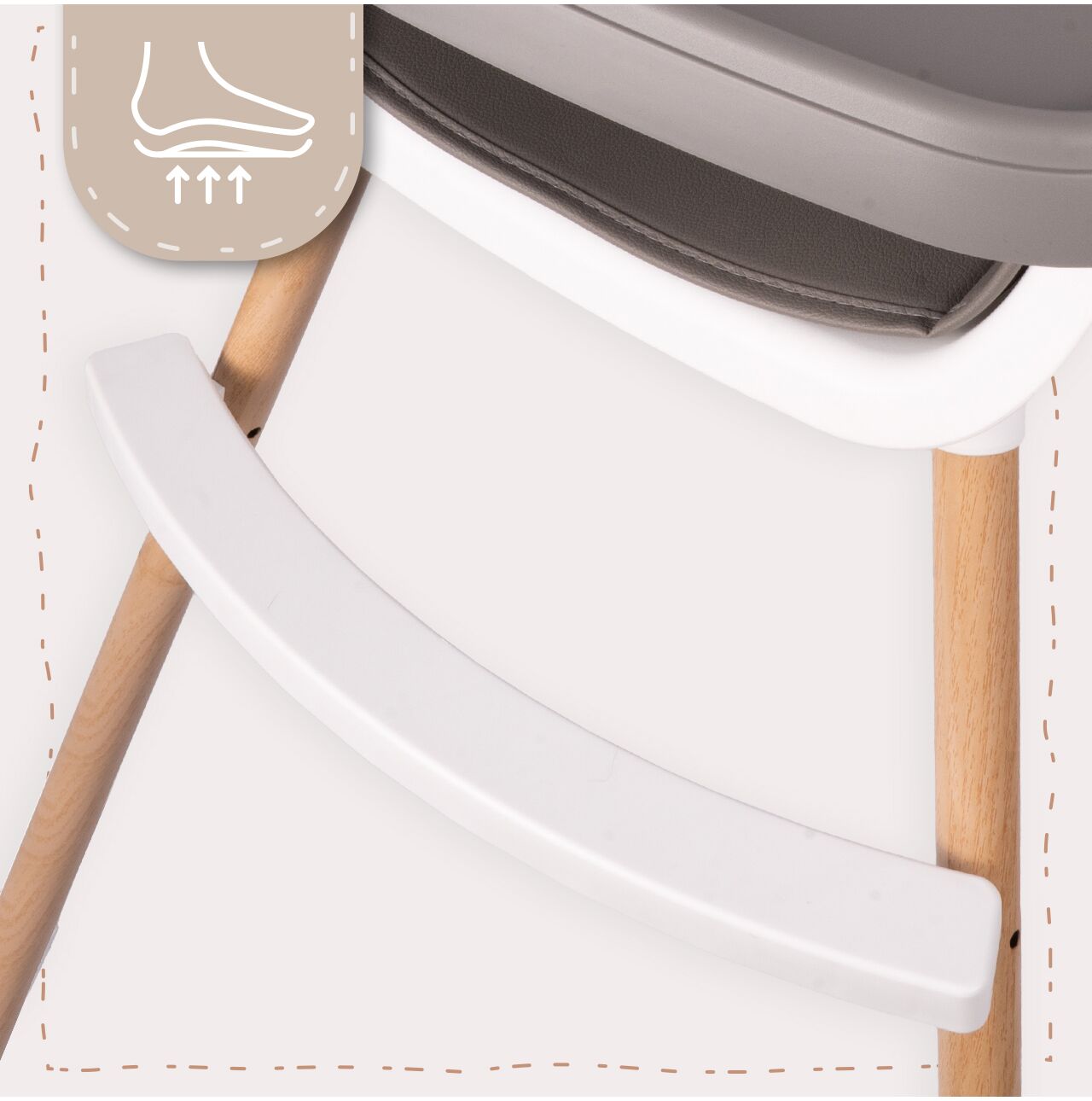 Suportul integrat pentru picioare, atasat intre picioarele din fata ale scaunului, ofera copilului un suport natural pentru picioare. Datorita acestui fapt, bebelusul poate sta intr-o pozitie ergonomica, ceea ce ii influenteaza confortul si sentimentul de siguranta in timp ce mananca sau se joaca.
