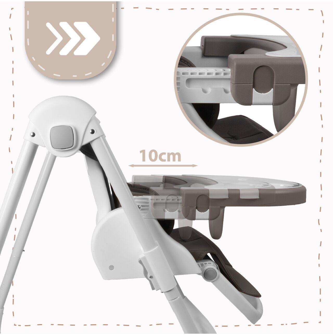 Scaunul inalt DELI este echipat cu o tava practica, din doua parti , pe care o puteti aseza in trei pozitii diferite, la distanta de copil . Aceasta este o solutie ideala care creste odata cu copilul si va permite sa adaptati mai bine spatiul la forma corpului sau. Datorita acestui fapt, copilul are libertate de miscare in timp ce mananca, iar parintele il poate pune si da jos mai usor din scaun.