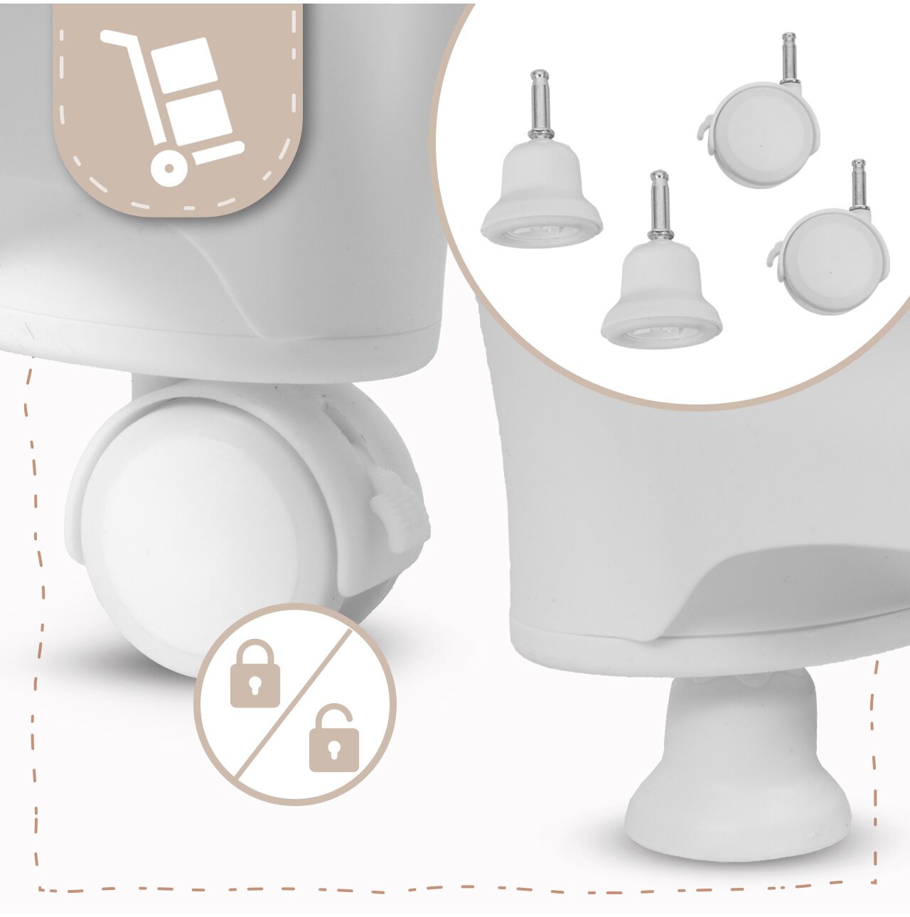 Scaunul DELI se pliaza rapid si intuitiv – nu aveti nevoie de niciun fel de unelte. Dupa pliere, ocupa putin spatiu, asa ca este usor de depozitat sau de luat in calatorie. Rotile din spate va permit sa mutati cu usurinta scaunul prin apartament fara a-l ridica.