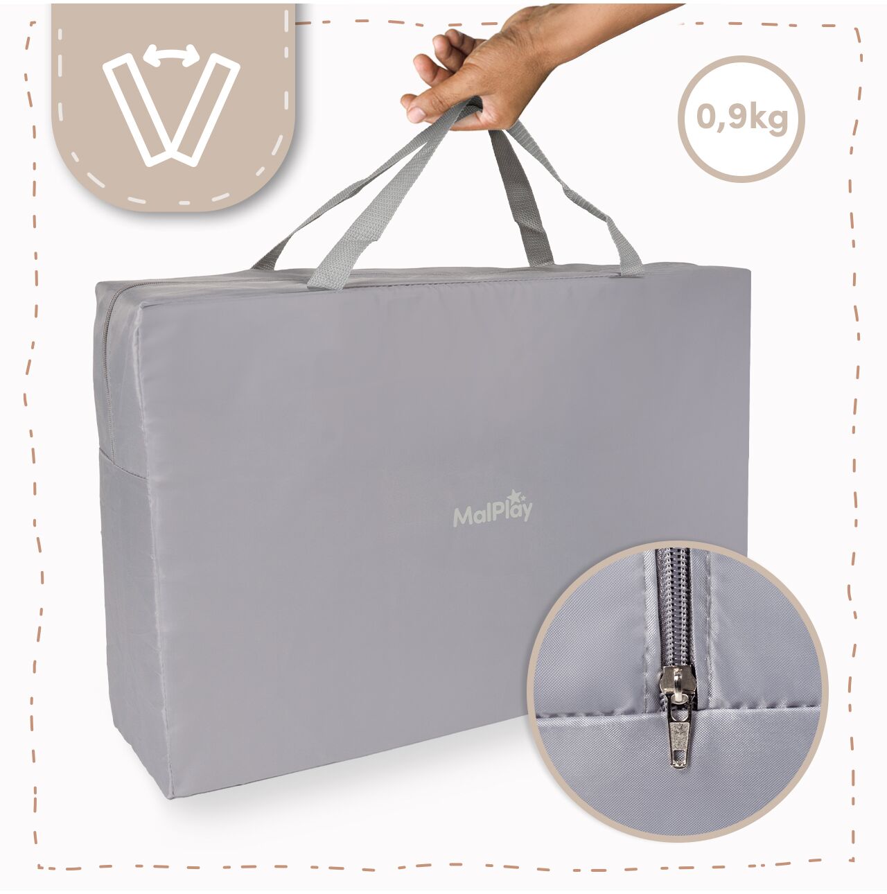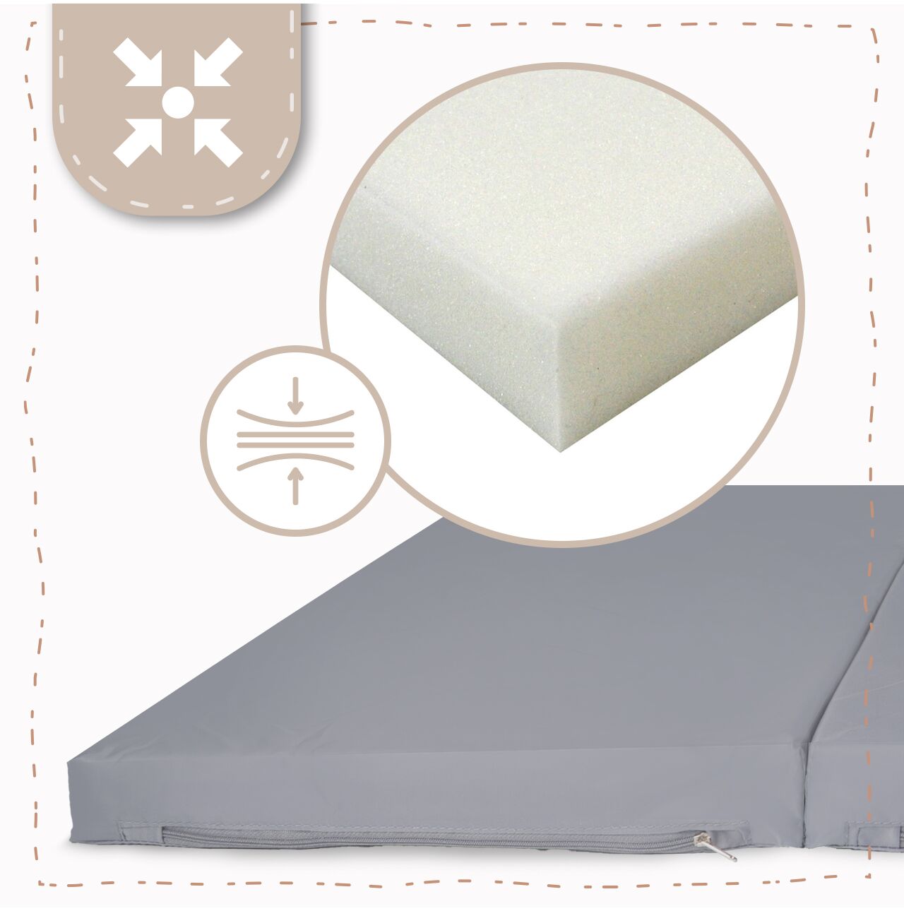 Datorita designului sau inteligent cu 3 panouri , salteaua se pliaza in cateva secunde. Odata pliata, ocupa un spatiu minim, fiind ideala pentru calatorii cu masina, trenul sau chiar avionul. Este inclusa o geanta de transport practica cu maner pentru a proteja salteaua de murdarie si a o face usor de transportat.