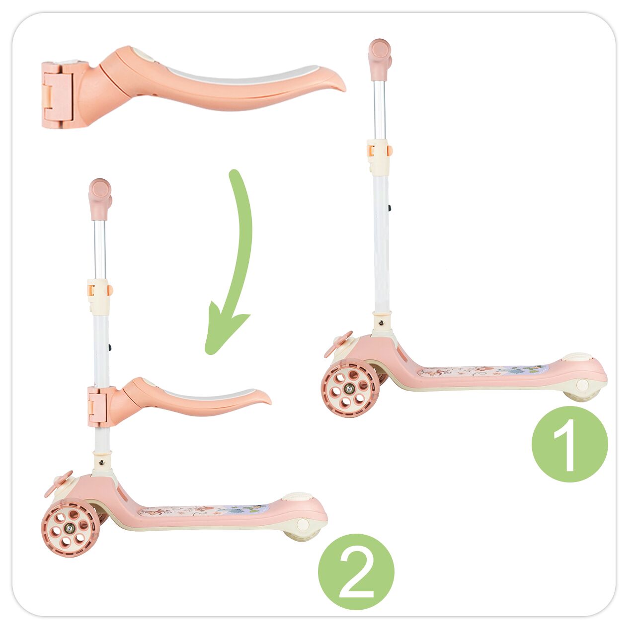Cu o singura miscare simpla, trotineta poate fi transformata dintr-o trotineta de calatorit intr-una clasica! Pur si simplu apasati un buton special si scaunul se ridica sau coboara, permitand copiilor mai mari sa o foloseasca in picioare.