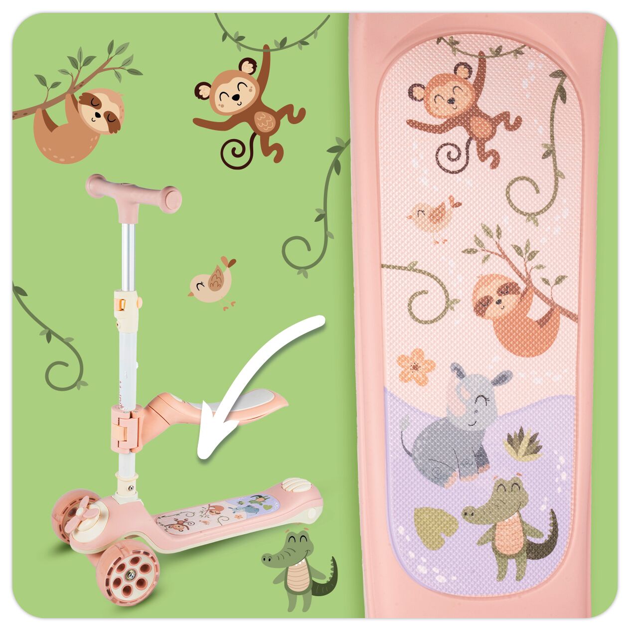 Puntea trotinetei este decorata cu un frumos motiv animalier care cu siguranta va captiva orice copil mic. Maimute vesele, lenesi, crocodili si alte animale fac mersul pe trotineta si mai placut. Ilustratiile colorate distreaza copiii si le stimuleaza imaginatia, incurajand joaca activa. Aceasta este alegerea perfecta pentru micii iubitori de animale si natura!