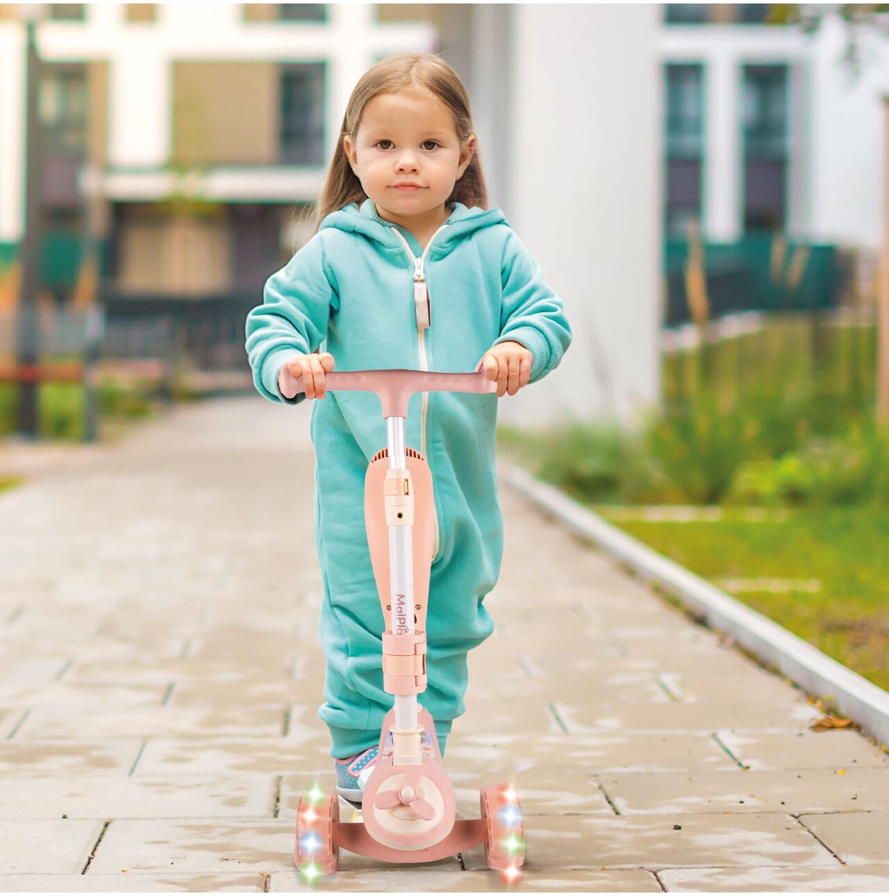 Rotile unice iluminate cu LED-uri confera trotinetei un aspect unic. Luminile LED se aprind in timpul miscarii, ceea ce nu numai ca aduce bucurie copiilor, dar le imbunatateste si vizibilitatea pe sosea sau pe trotuar. Acest lucru face ca joaca sa fie nu doar mai interesanta, ci si mai sigura!