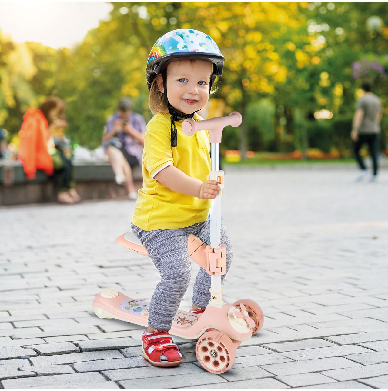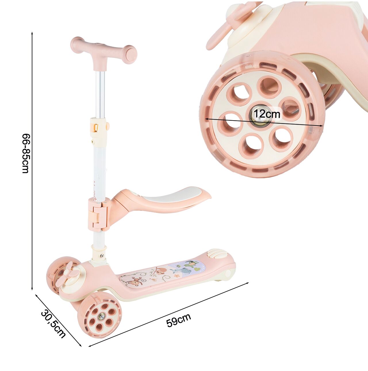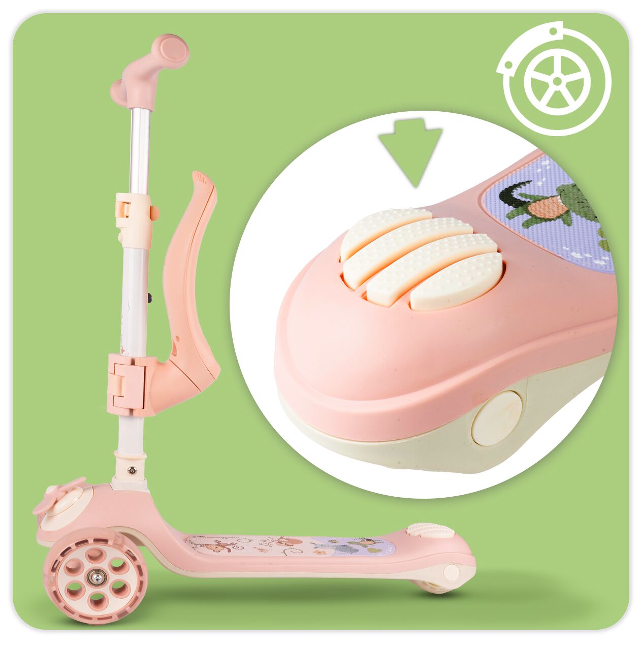 O trotineta cu trei roti este o distractie deosebita in aer liber! Copiii se pot bucura de mersul pe o trotineta sau un ride-on, dezvoltandu-si in acelasi timp coordonarea motorie si echilibrul. Rotile luminoase cu LED-uri si designul atractiv cu animale incurajeaza joaca activa in timpul plimbarilor sau la locul de joaca. Ideala pentru copiii cu varsta de 2 ani si peste.