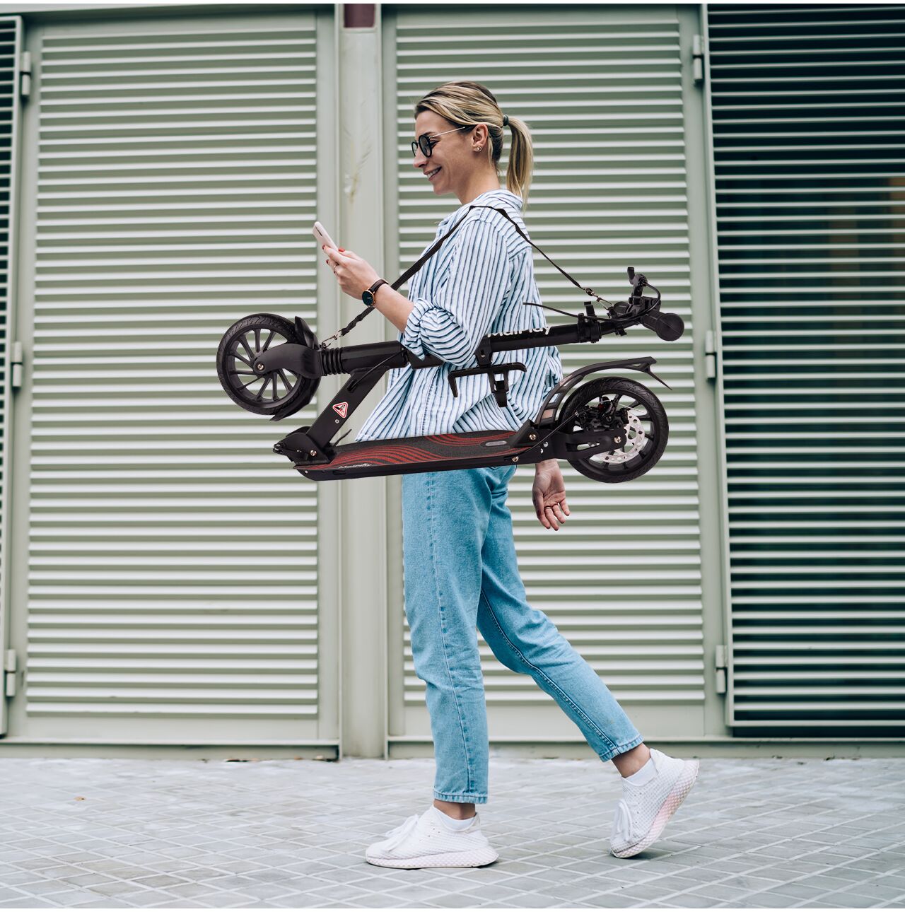 - Trotineta este echipata cu o curea de transport practica , care o face mult mai usoara de transportat.