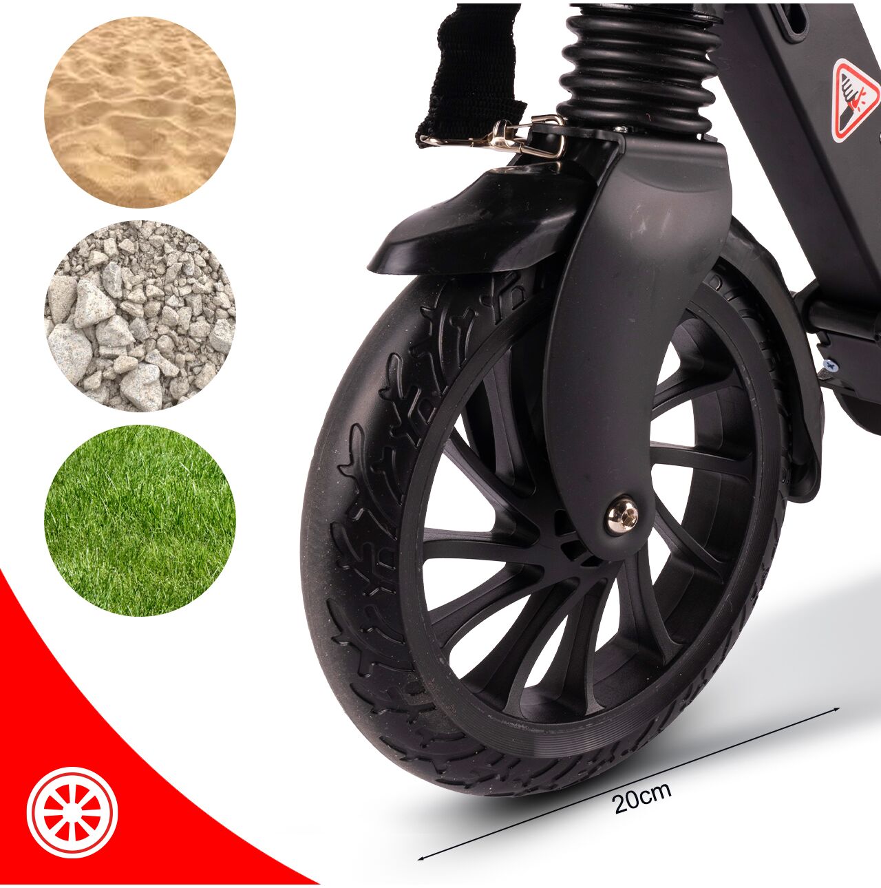 Trotineta este echipata cu roti mari, de 20 de centimetri , care garanteaza stabilitate, confort si siguranta in timpul mersului. Datorita acestora, puteti naviga cu usurinta pe diverse tipuri de suprafete - asfalt, pavaj si chiar teren accidentat .