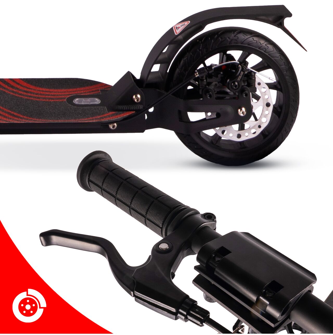 Siguranta este o prioritate, motiv pentru care trotineta este echipata cu o frana pe disc spate si o frana de picior clasica. Aceasta solutie asigura o oprire rapida si eficienta, indiferent de conditiile meteorologice.