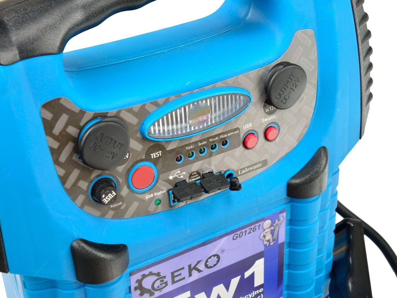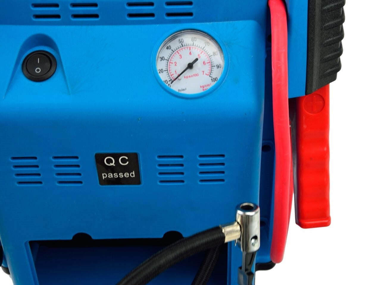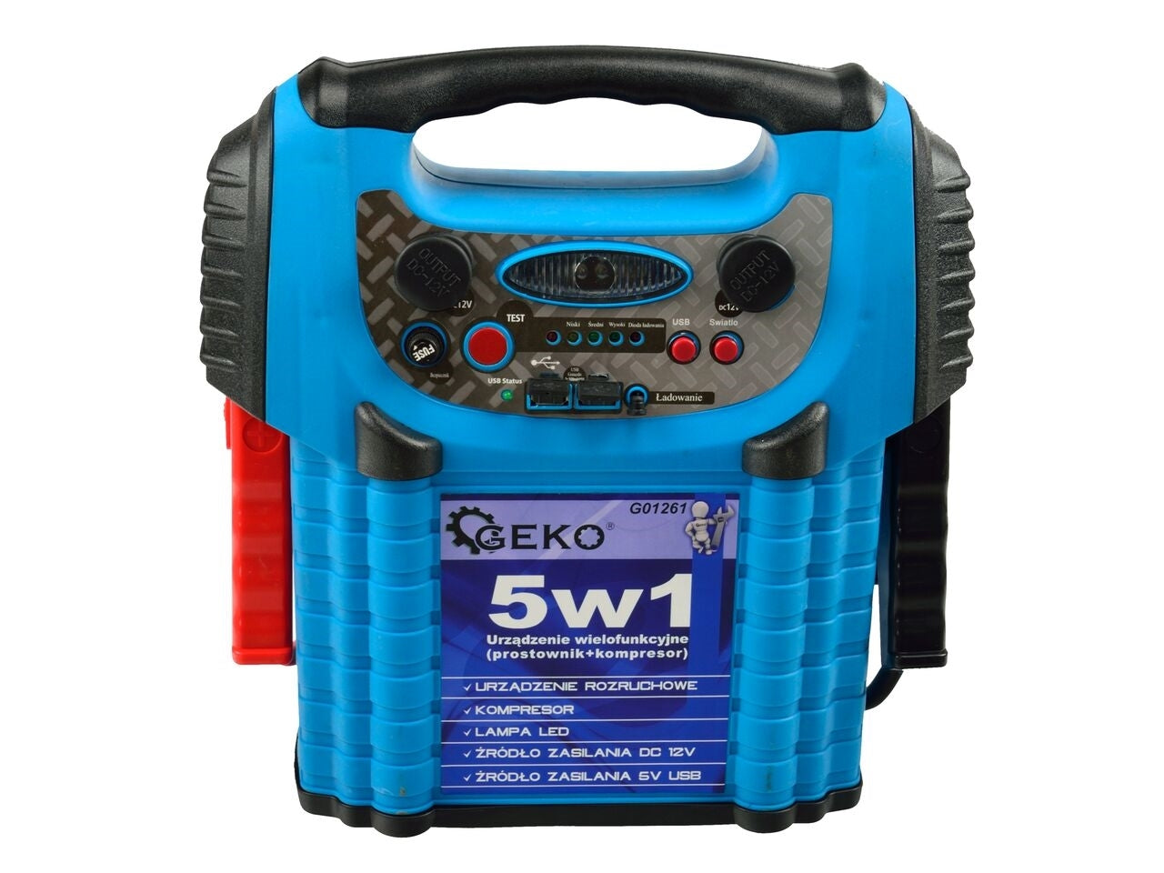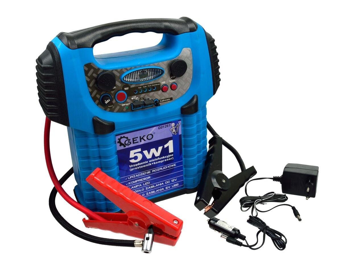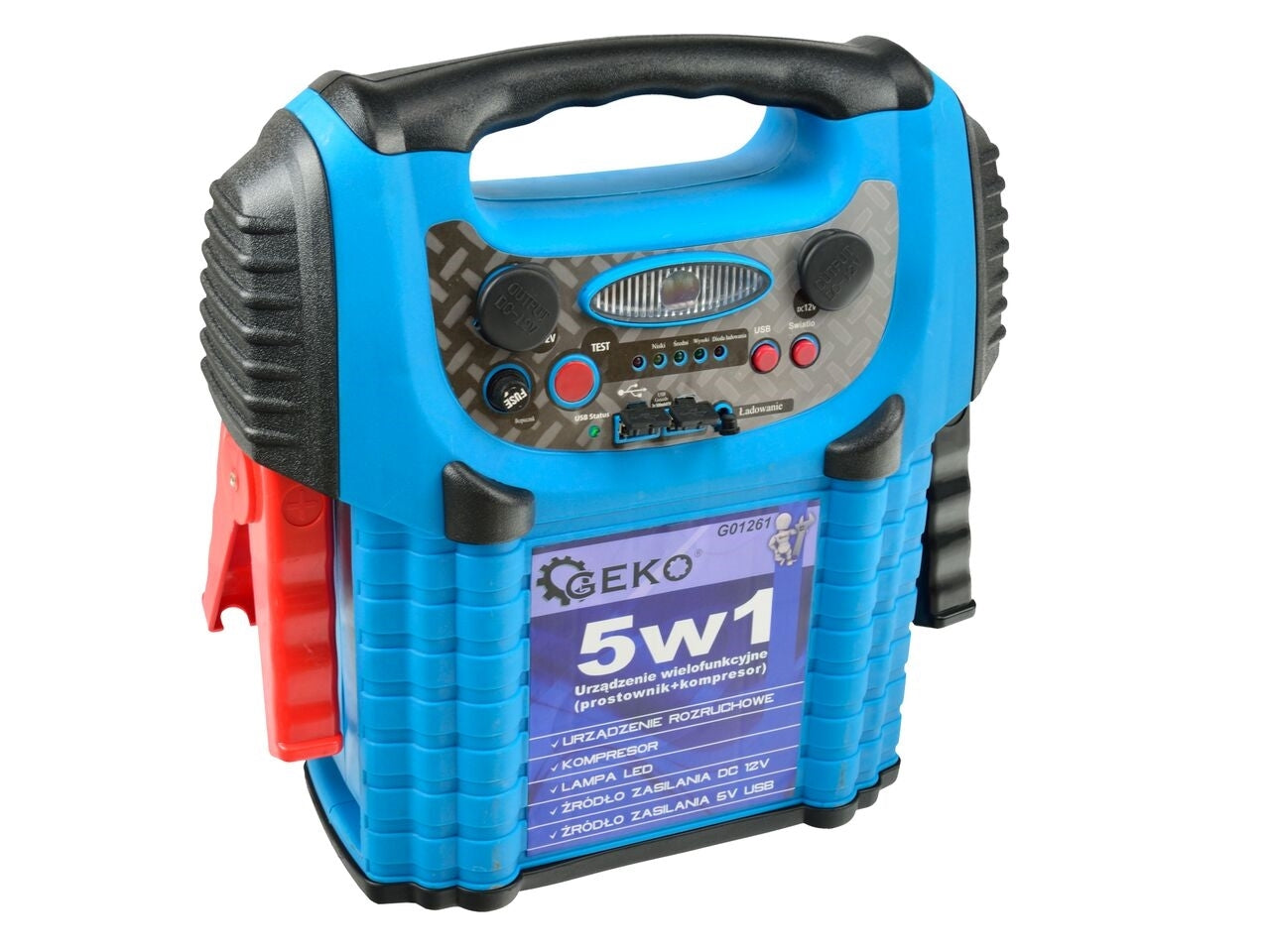 Dispozitiv multifunctional 5-in-1 fiabil, util in orice garaj sau atelier. Dispozitivul are functiile de: pornire, redresare, lanterna si compresor intr-un singur dispozitiv.