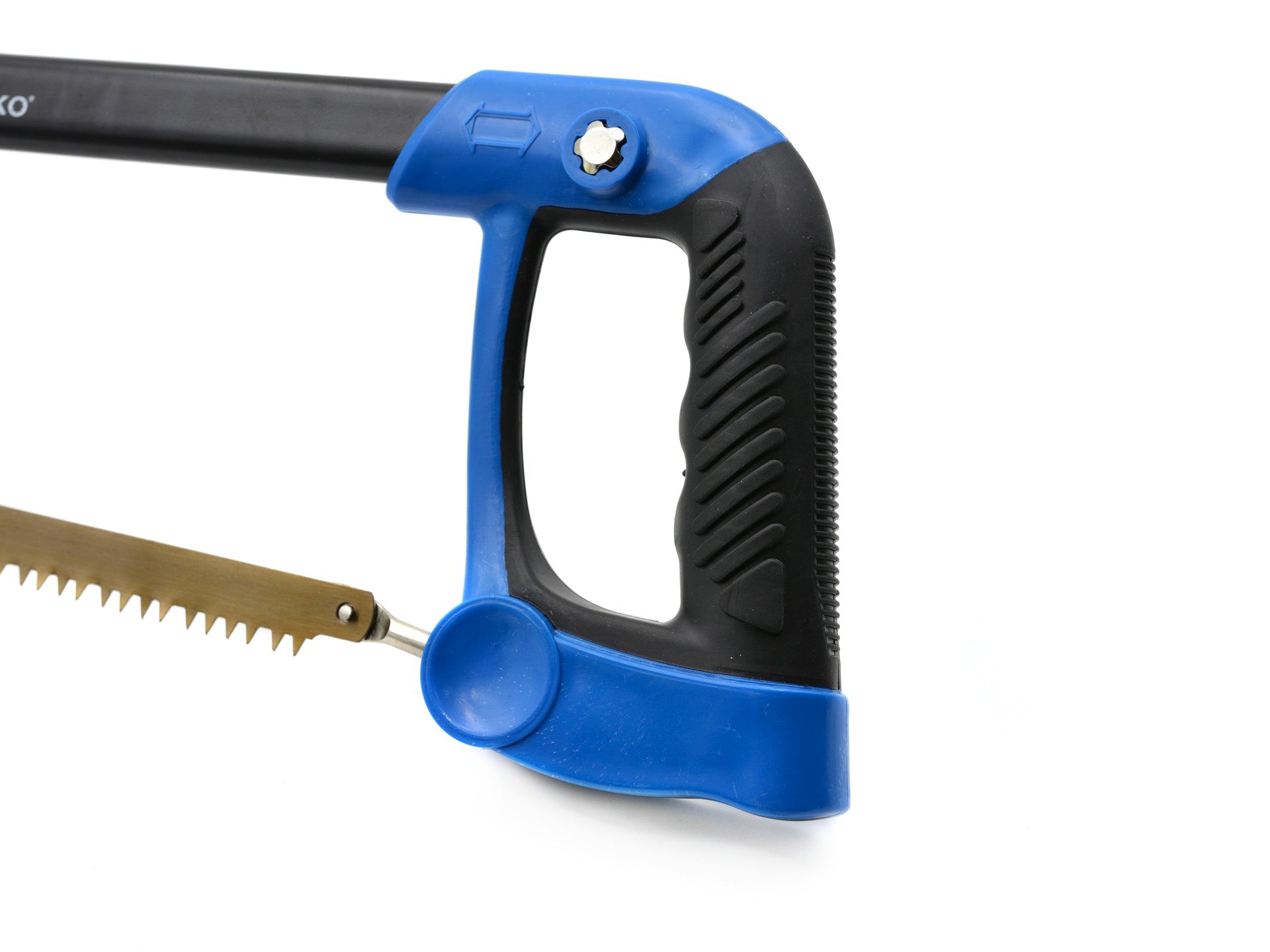 Fierăstrău cu arc pentru tăierea metalului de 300 mm cu reglare a unghiului 0, 45 și 90 de grade. Mâner antiderapant acoperit cu cauciuc moale. Reglarea tensiunii lamei permite tensionarea corectă a lamei. Permite tăierea obiectelor cu un diametru de până la 100 mm.