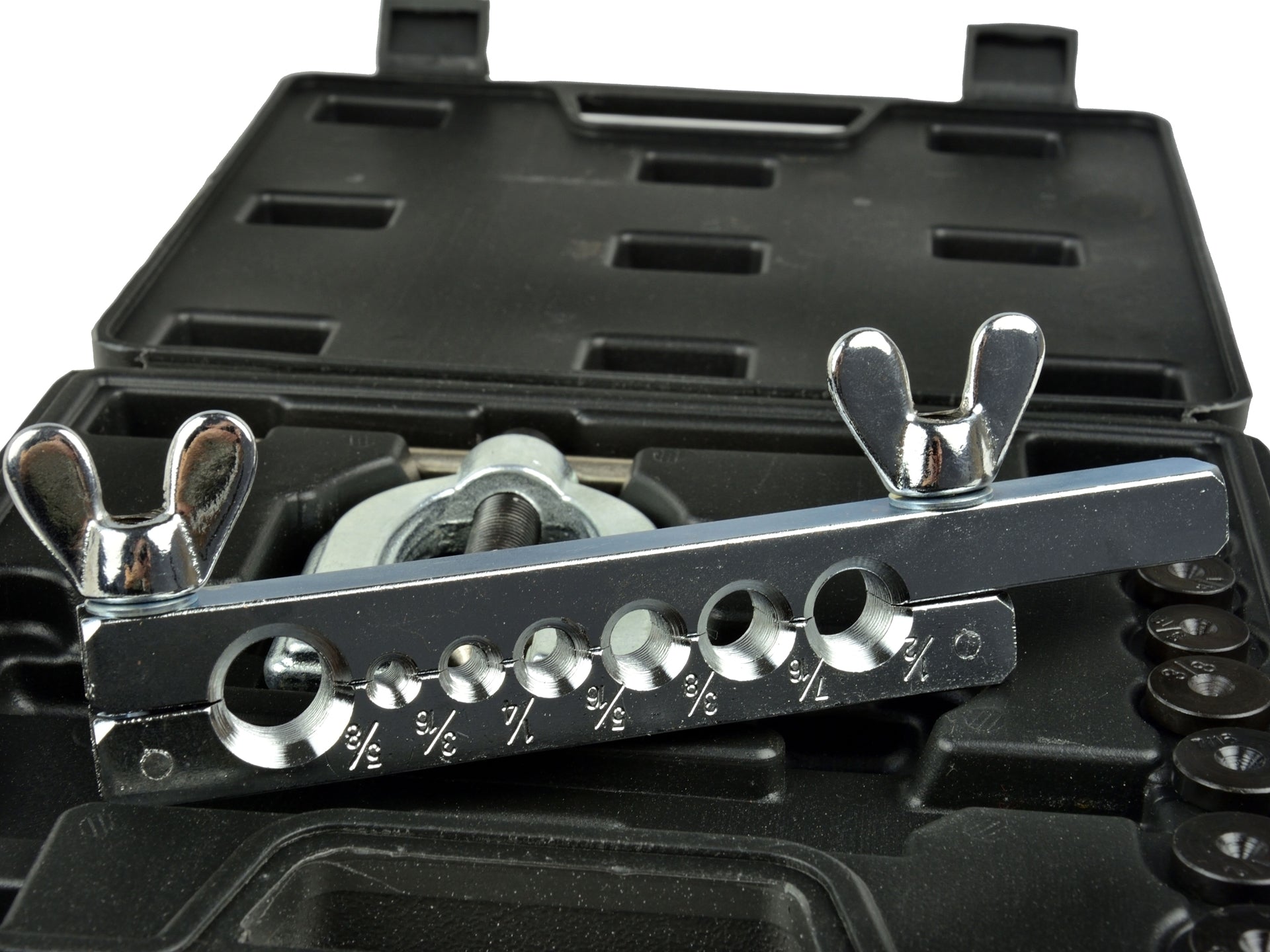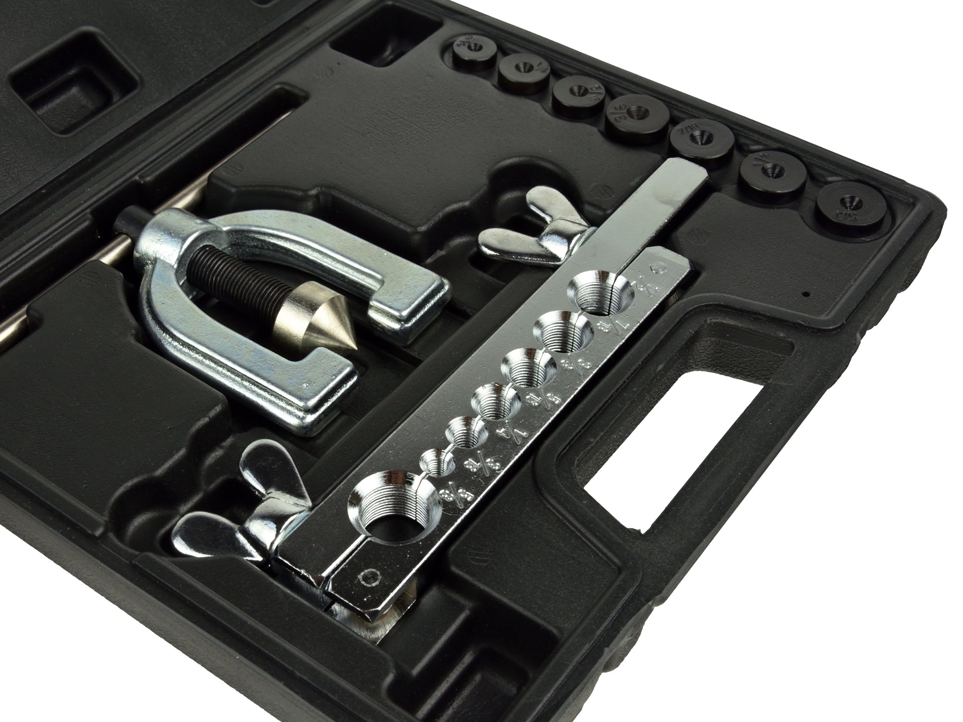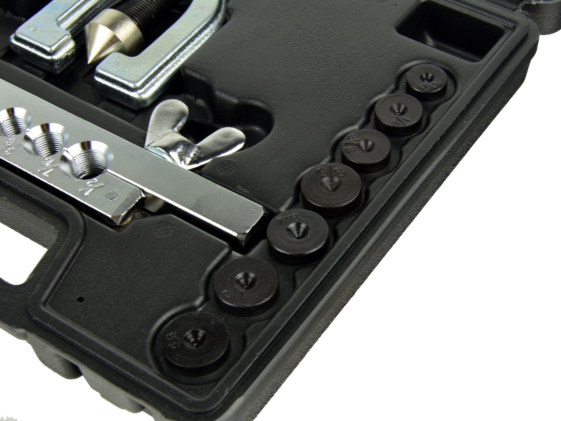 Un set pentru castigarea conductelor de frana si combustibil. Este potrivit pentru taierea si evazarea tevilor si cablurilor din cupru, alama, aluminiu si pereti cu grosimi de pana la 1 mm.