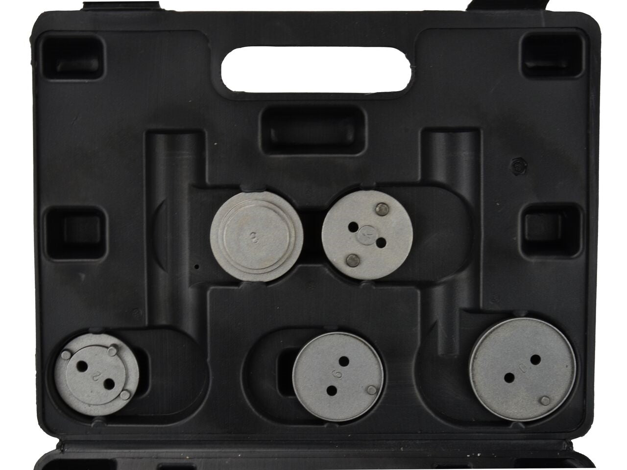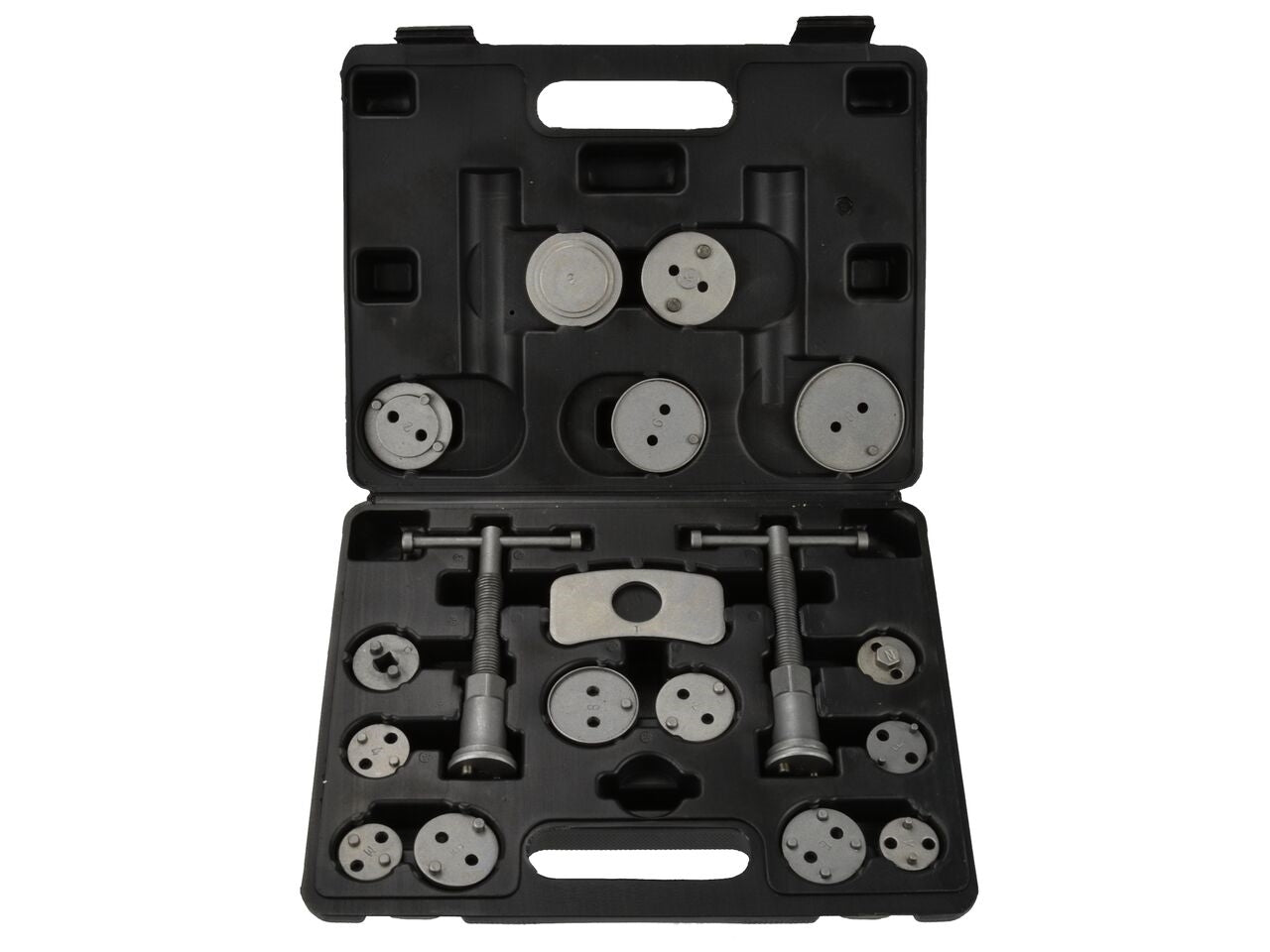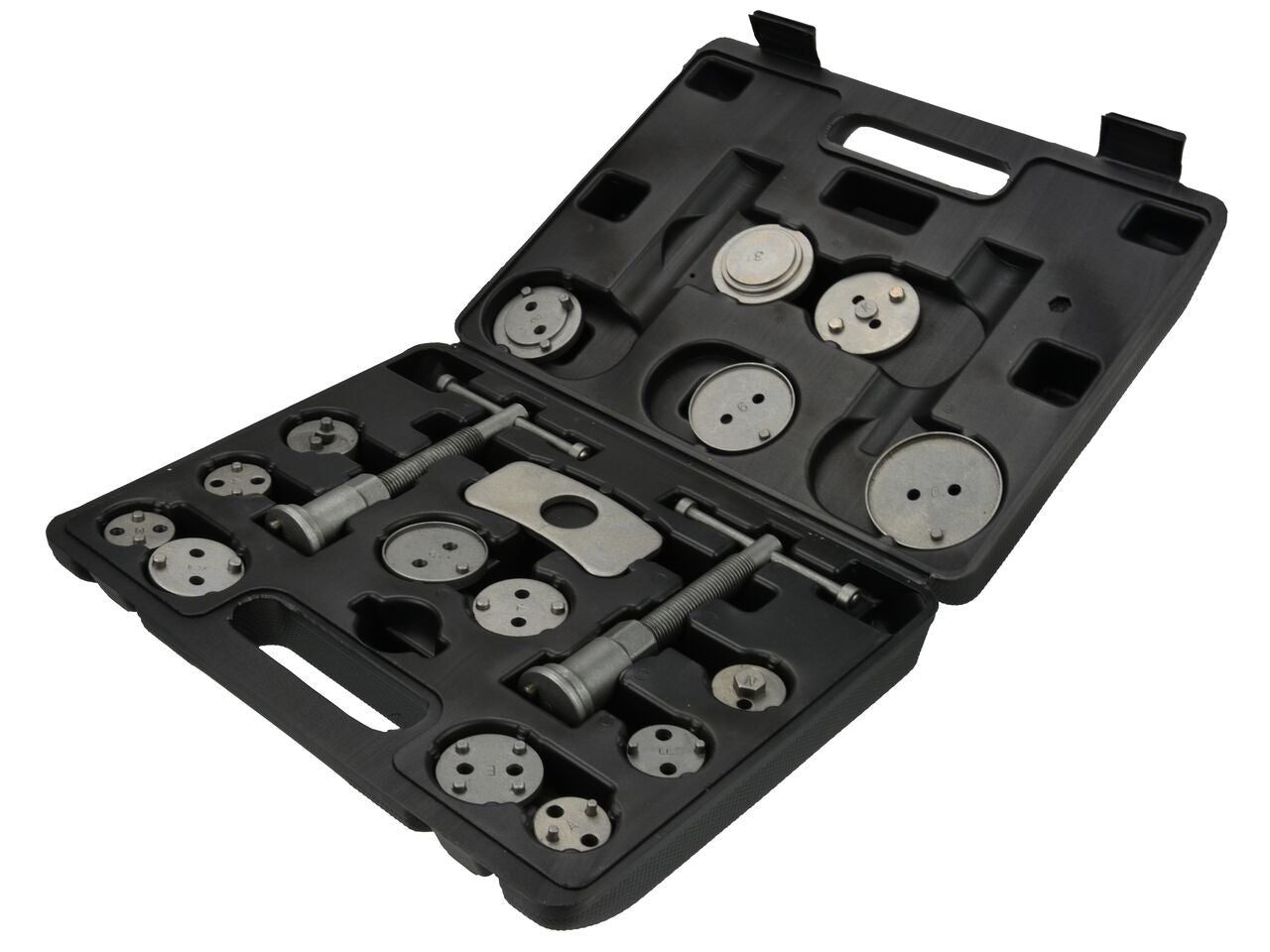 Set profesional de 18 piese pentru retragerea/strangerea pistoanelor de frana, indispensabil pentru repararea vehiculelor echipate cu frane cu disc.