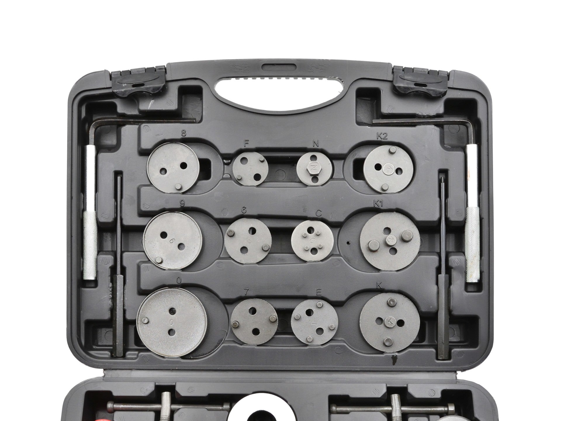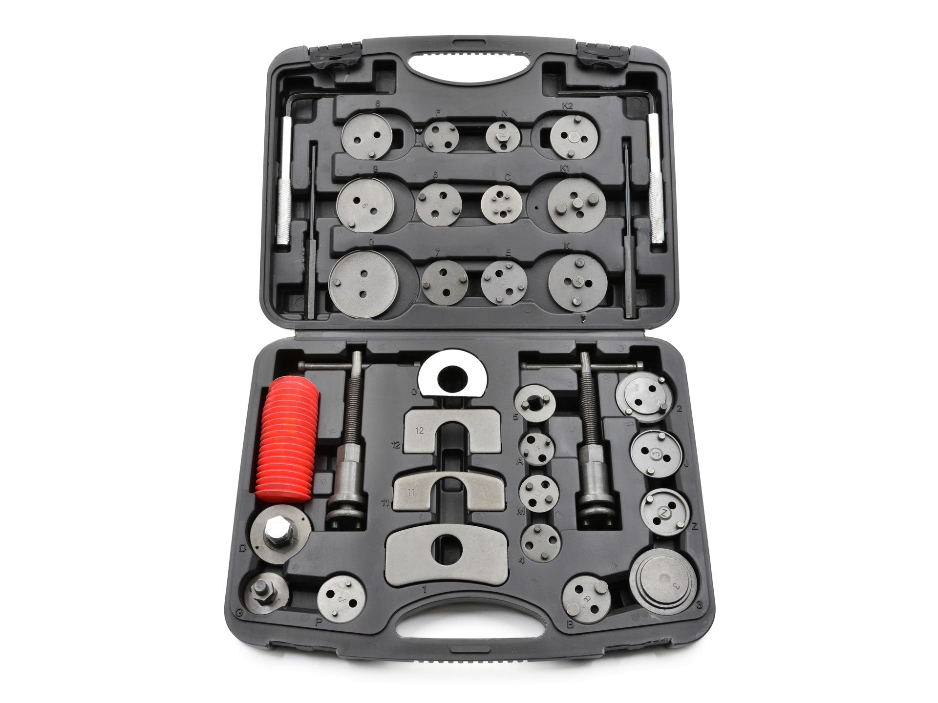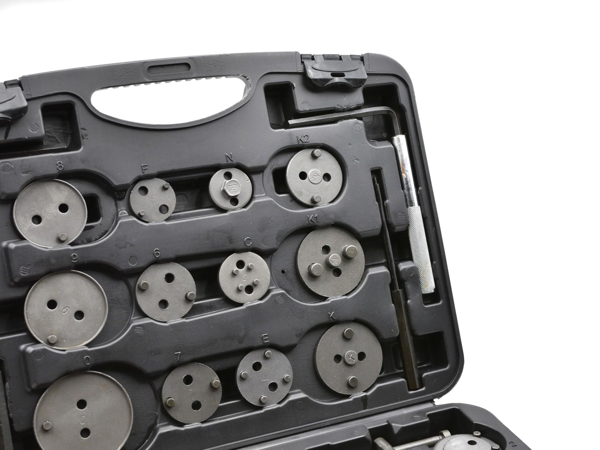 Set profesional de 35 de piese pentru retragerea / strângerea pistoanelor de frână, necesar pentru repararea vehiculelor echipate cu frâne cu disc.
