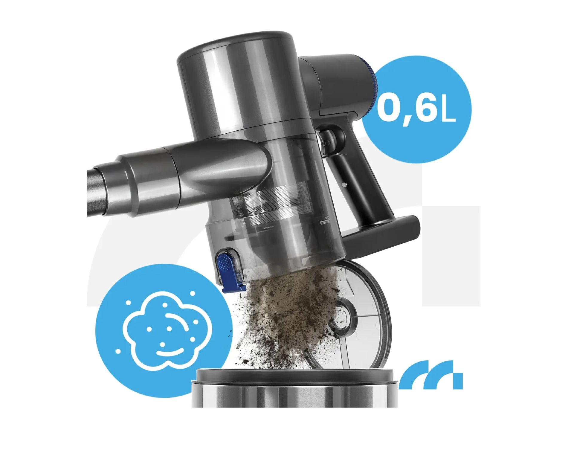 Modelul PRO3000 are un recipient de praf de 600 ml care poate fi golit cu un singur clic – fara contact cu murdaria .