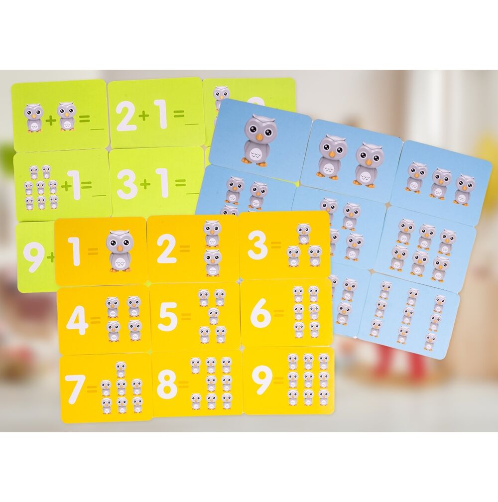 Setul include carti de joc in trei culori care infatiseaza numere, animale si diverse operatii matematice simple, datorita carora copilul tau mic va putea face primii pasi in adunare si recunoasterea numerelor.