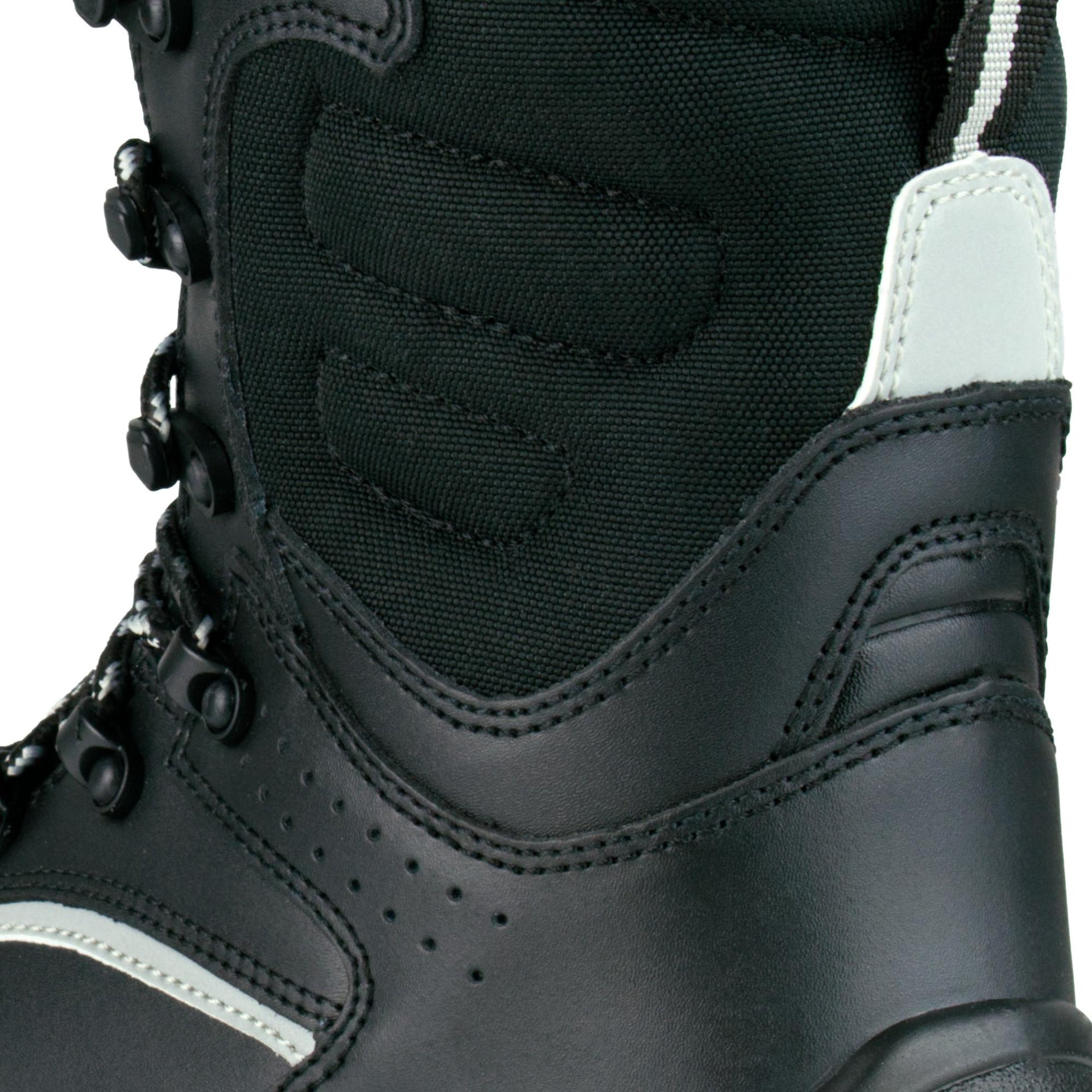 · Partea superioara este confectionata din piele de vaca neagra si material impregnat, impermeabil. Prezinta elemente reflectorizante care sporesc aspectul vizual al incaltamintei.