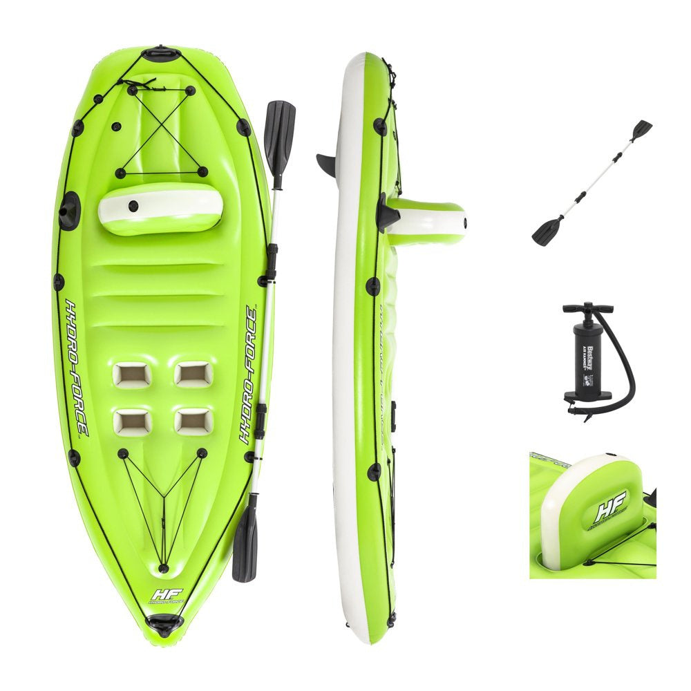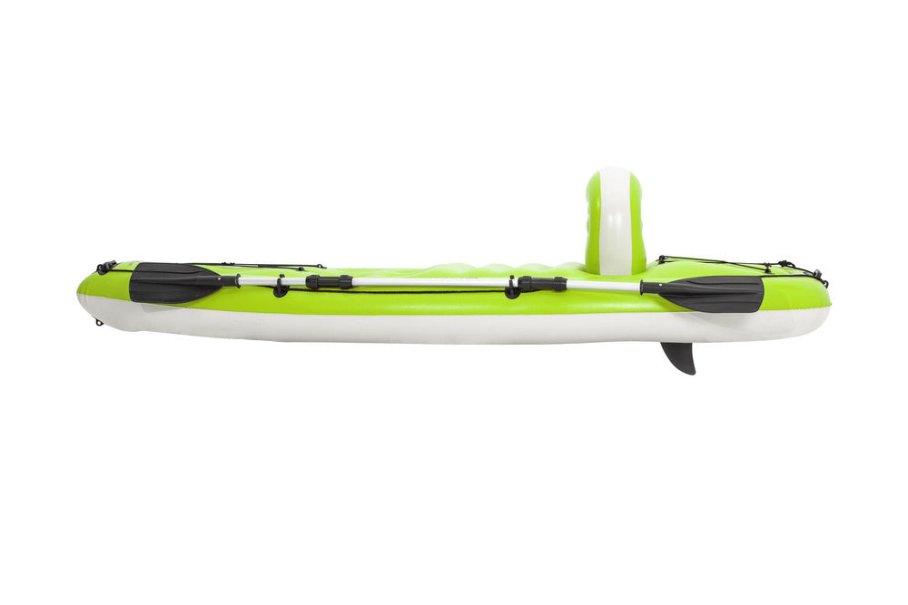 O iesire pe apa este o modalitate ideala de a va petrece timpul liber. Pentru a face acest timp lipsit de griji mai placut, echipati-va cu accesorii suplimentare pentru piscina. Acest caiac este conceput pentru pescuitul pe apa. De asemenea, este perfect pentru o excursie relaxanta pe lac sau la piscina. Este fabricat din vinil durabil, rezistent la deteriorari. Acum puteti pescui confortabil, complet cu un suport incorporat pentru undita si incuietori pentru vasle. Caiacul dispune, de asemenea, de un spatar gonflabil pentru relaxare maxima si patru suporturi pentru picioare pentru utilizatori de toate dimensiunile. Ideal pentru transport si depozitare compacta. Inotatoarea dorsala este detasabila, ceea ce face ca acest caiac sa fie si mai usor de depozitat. Acest kit include, de asemenea, o pompa manuala Air Hammer™ pentru umflare rapida si usoara, o vasle si un petic de reparatii.