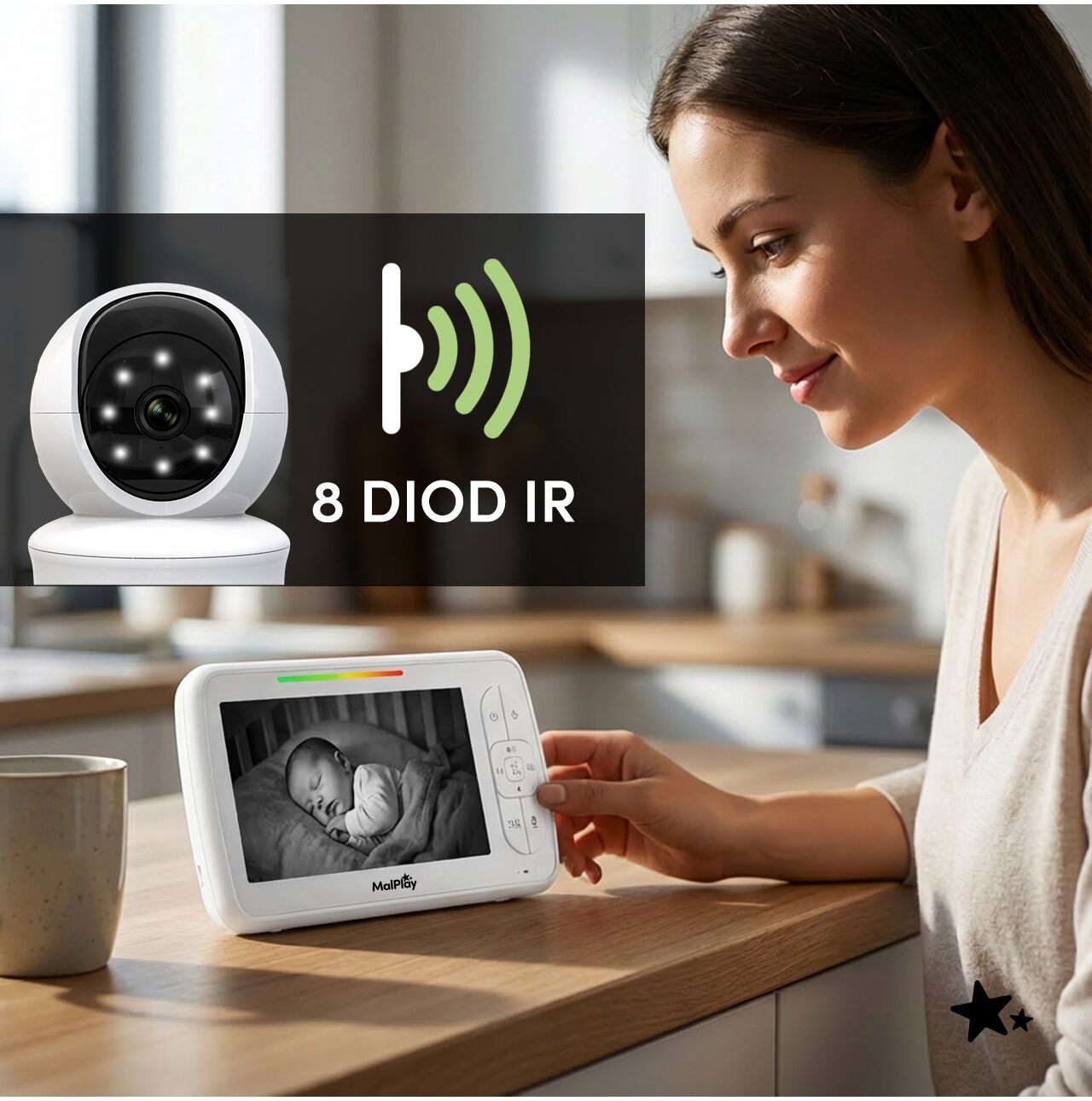 - Vederea nocturna automata cu infrarosu va permite sa monitorizati bebelusul chiar si in conditii de lumina foarte slaba, fara a fi nevoie sa aprindeti luminile. Camera utilizeaza 8 LED-uri IR si un senzor de lumina , ceea ce face ca trecerea la modul nocturn sa fie convenabila si intuitiva. Aceasta este o solutie practica pentru treziri nocturne, pui de somn si supraveghere constanta, fara a fi nevoie sa vizitati constant camera.