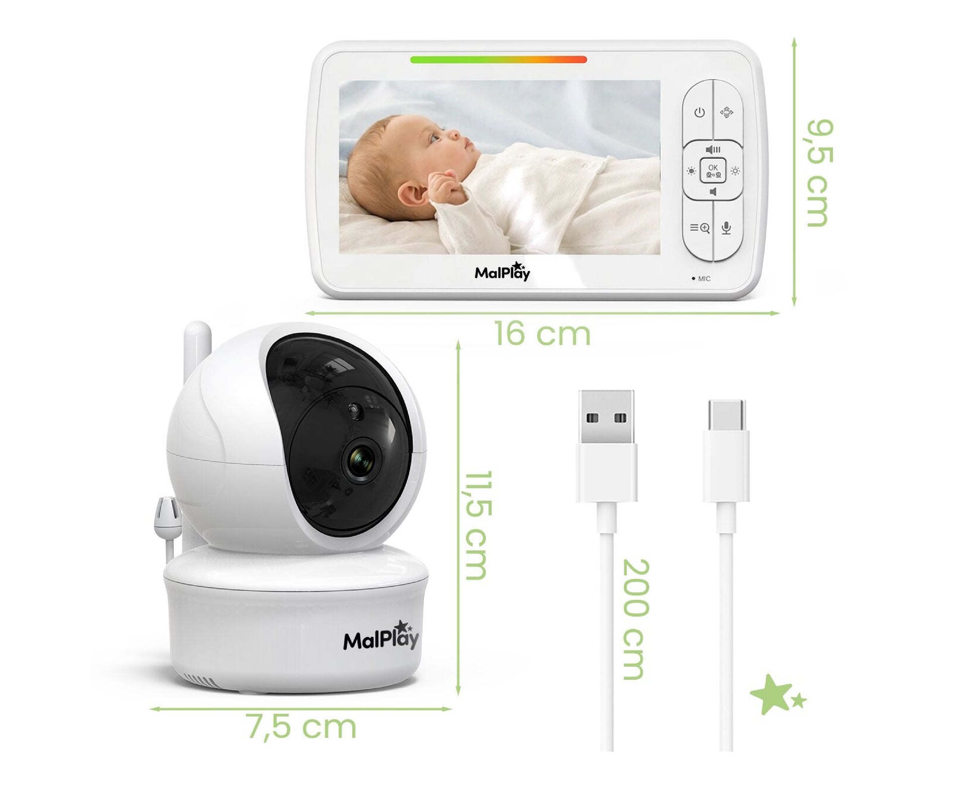 Kitul include o camera pentru bebelusi si un monitor parental cu un ecran mare, usor de citit, de 5,0" , gata de utilizare imediat dupa conectare. Monitorul este perfect atat pentru somnul de zi, cat si pentru somnul nocturn al copilului dumneavoastra.