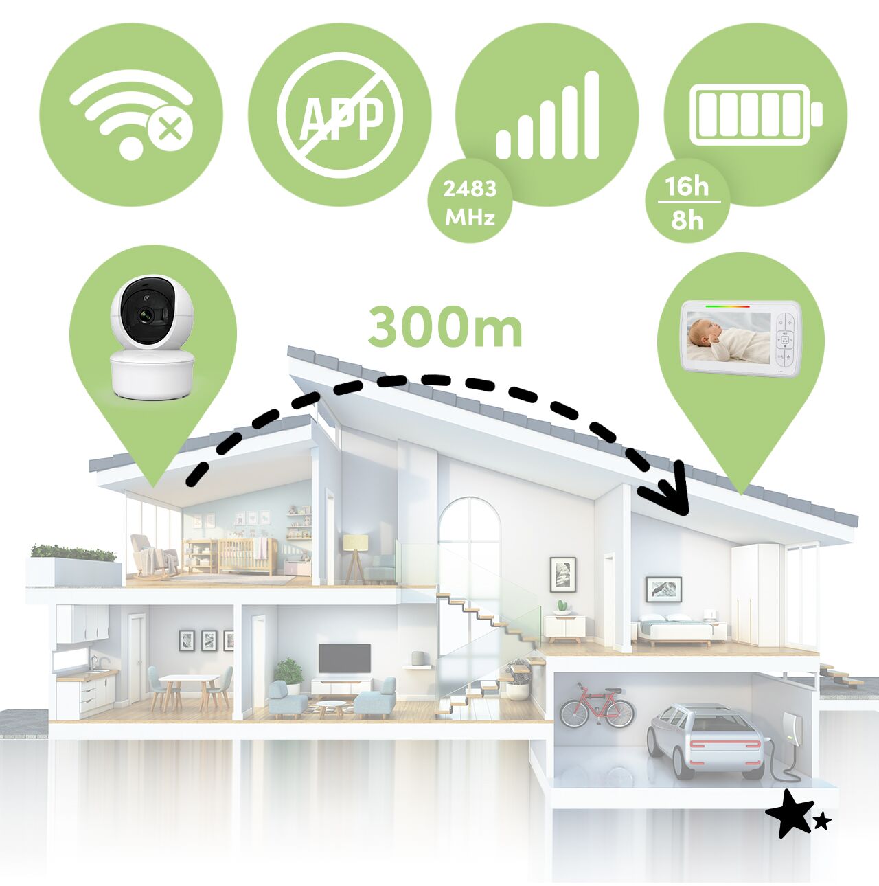 NannyEye Vision 5.0" este un monitor electronic modern pentru bebelusi care ofera monitorizare constanta si monitorizare a bebelusului in timp real. Datorita transmisiei FHSS securizate de 2,4 GHz , dispozitivul functioneaza fara Wi-Fi sau internet , sporind confidentialitatea si stabilitatea conexiunii.
