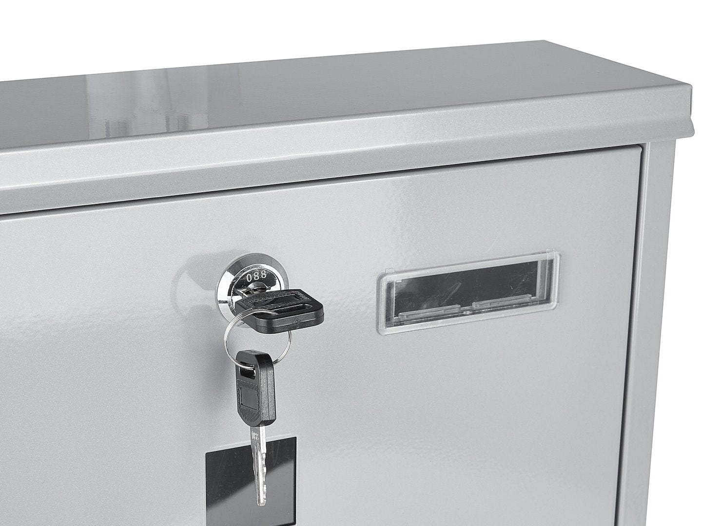 Aceasta cutie postala moderna, cu dimensiunile de 34 x 30,7 x 10 cm, este solutia perfecta pentru cei care apreciaza eleganta, durabilitatea si securitatea corespondentei lor. Fabricata din otel gri solid, vopsit in camp electrostatic , se potriveste perfect cu fatadele contemporane si usile de intrare. Vitrajul subtil al usii adauga o nota moderna si va permite sa verificati rapid daca exista corespondenta in interior.
