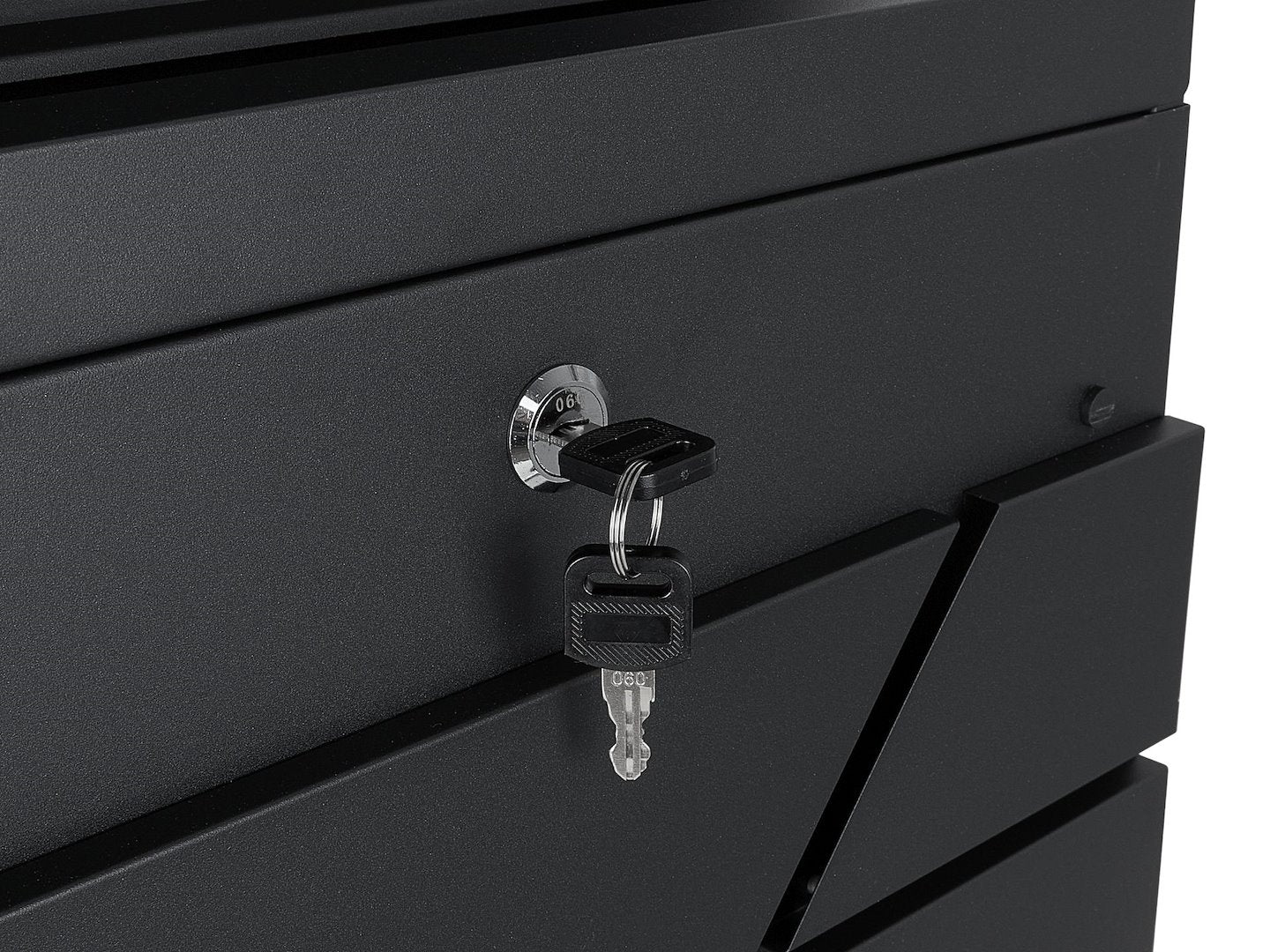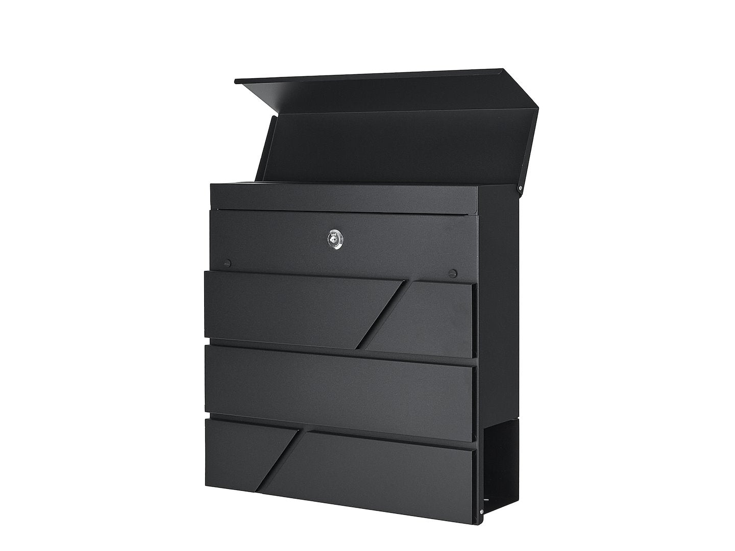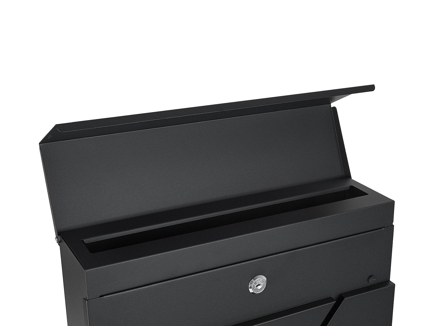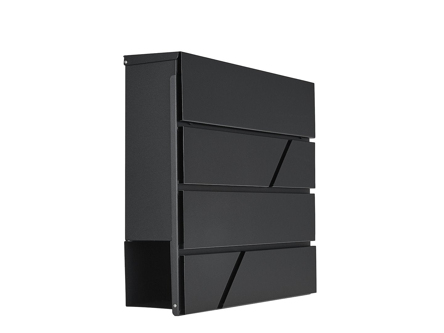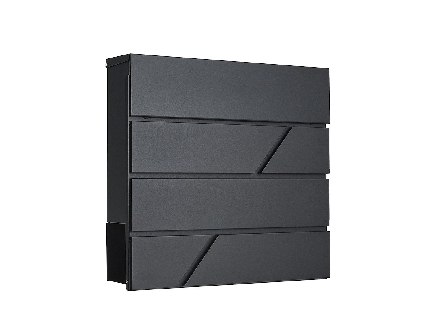 Aceasta cutie postala eleganta si minimalista , cu dimensiunile de 36,7 x 37 x 10 cm, combina stilul si caracterul practic. Fabricata din otel vopsit in camp electrostatic de inalta calitate, intr-o culoare antracit la moda , se integreaza perfect in arhitectura moderna a cladirilor rezidentiale si de birouri. Stanta geometrica in relief de pe partea frontala ii confera un aspect unic, de design.