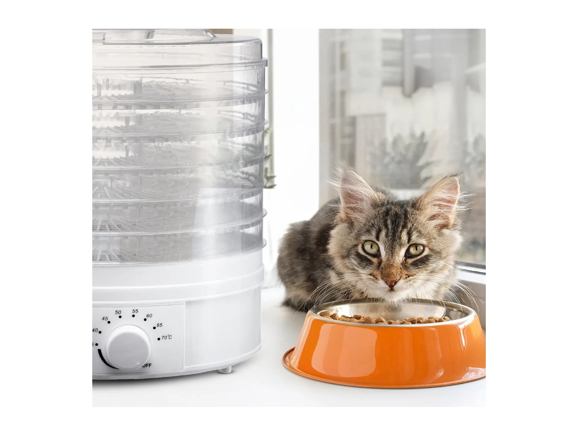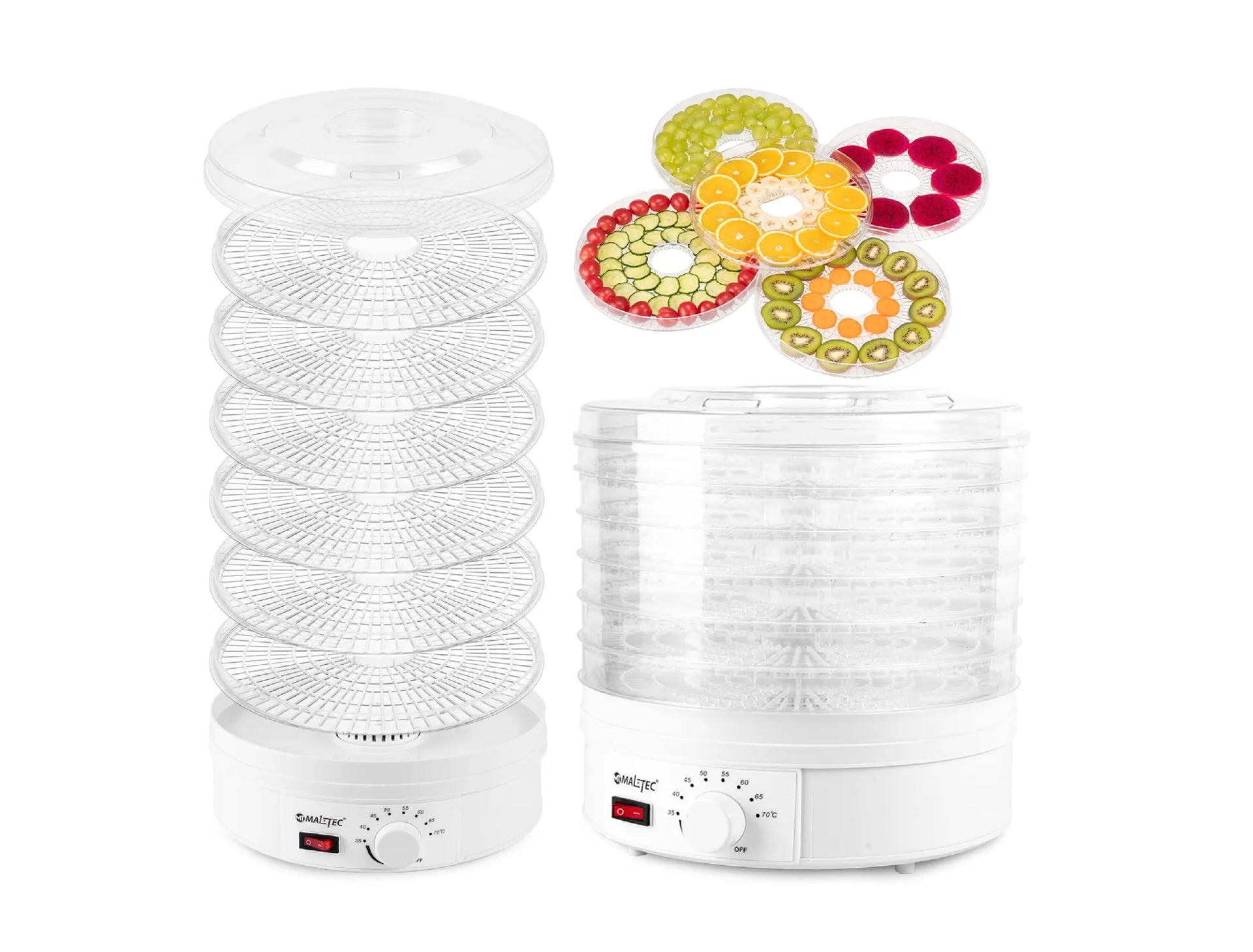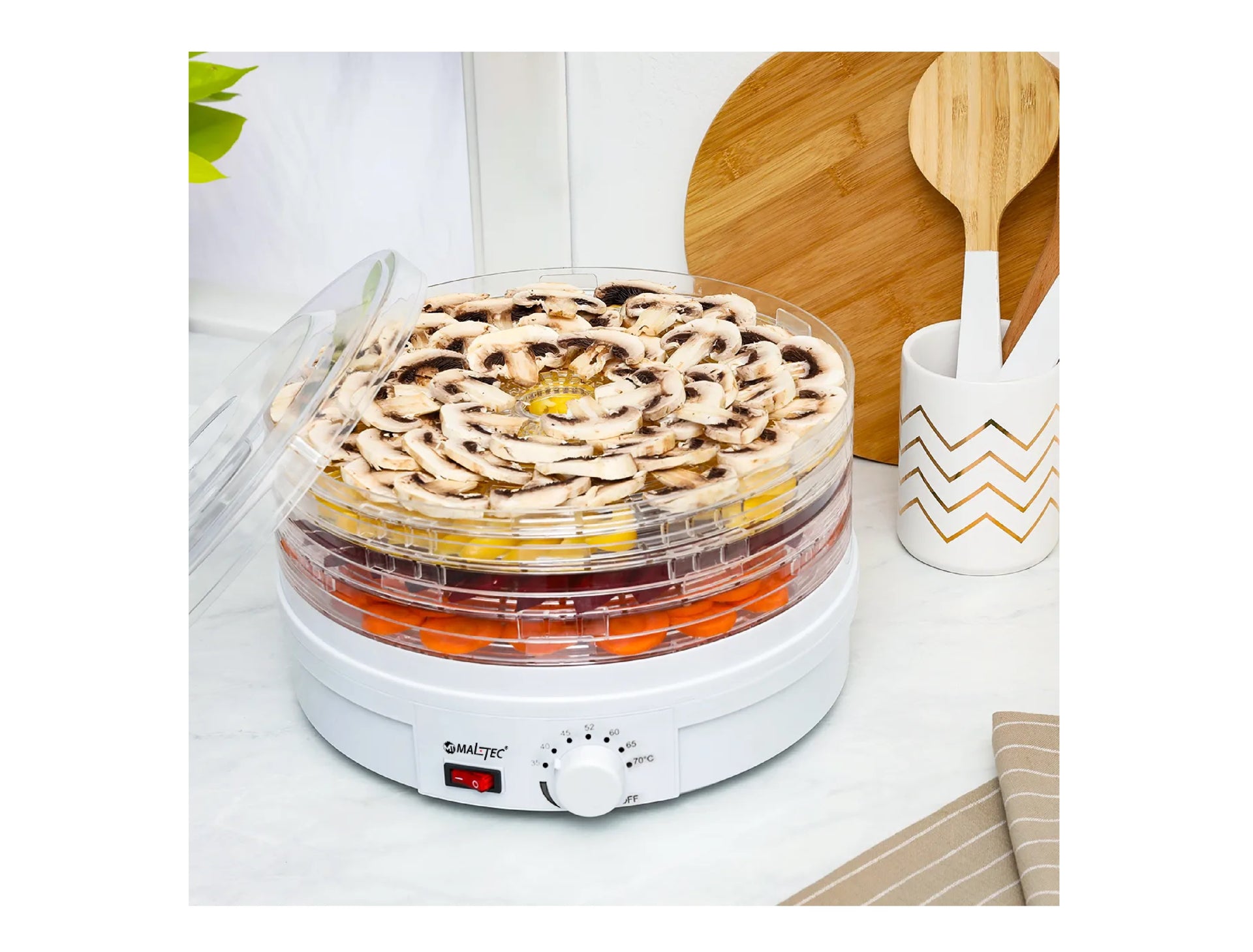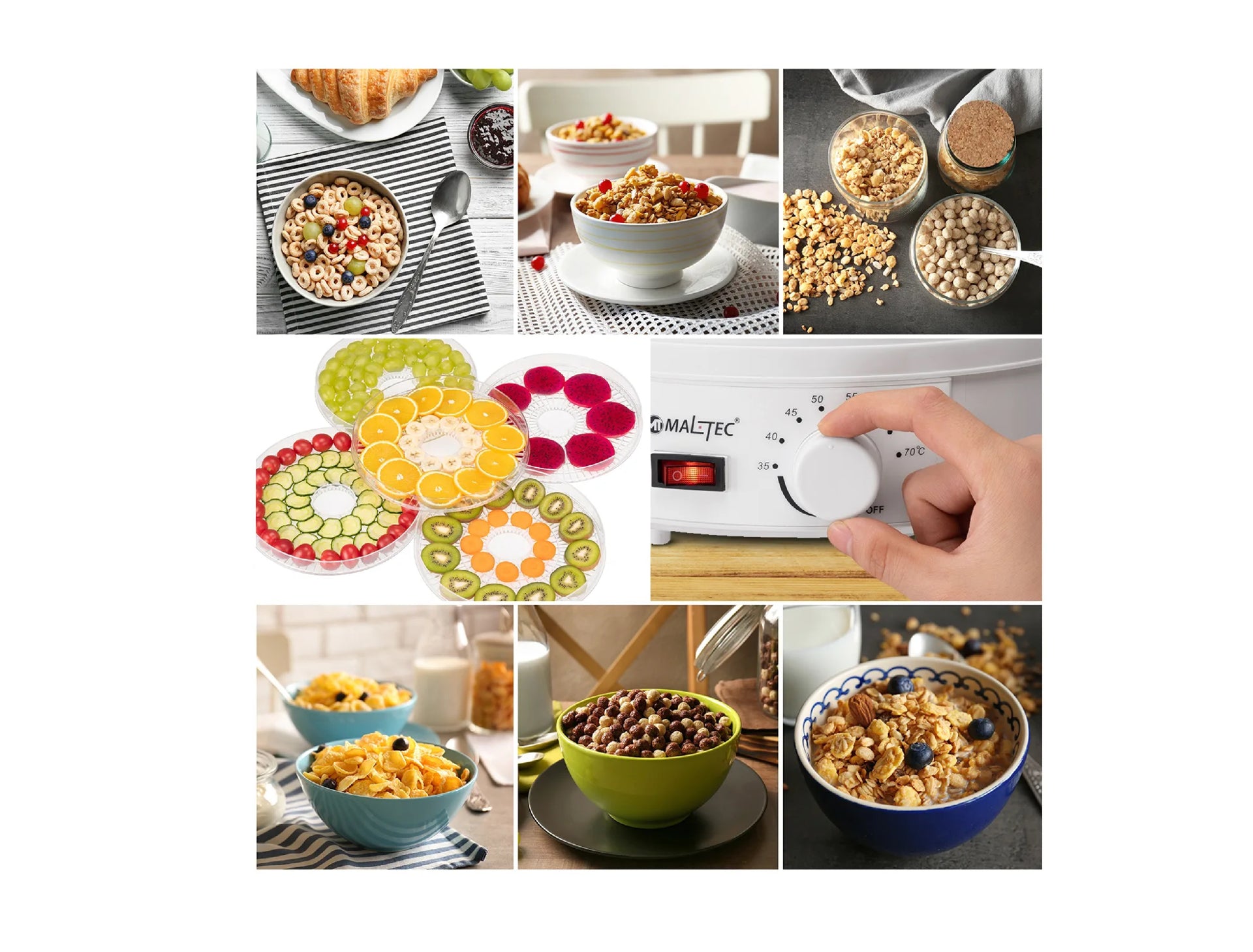 Reglarea temperaturii pe 8 trepte, cuprinsa intre 35-70°C, va va permite sa adaptati perfect temperatura tipului de hrana uscata.