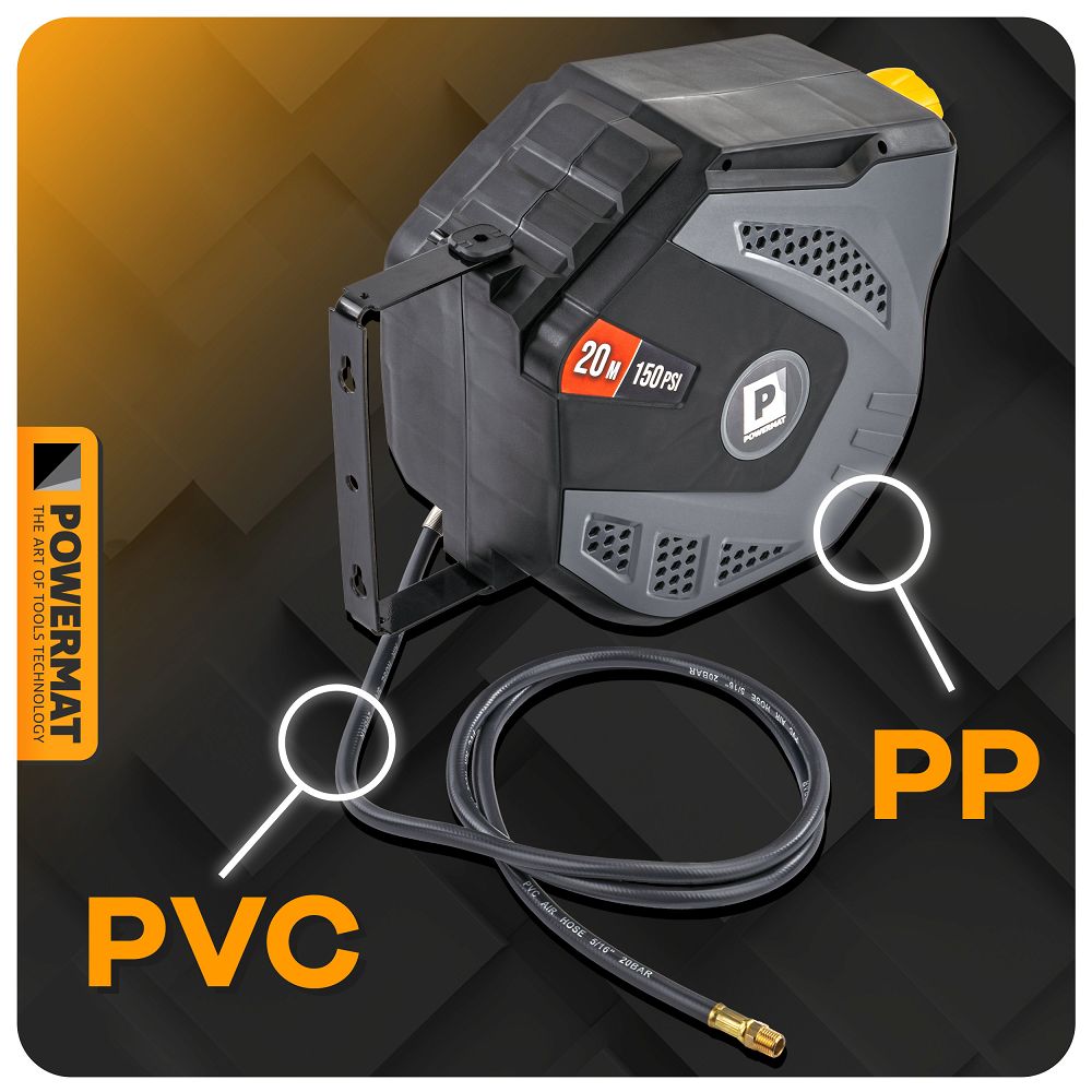 Carcasa din polipropilena (PP) ofera rigiditate si rezistenta la impact, in timp ce furtunul din PVC combina flexibilitatea cu durabilitatea.