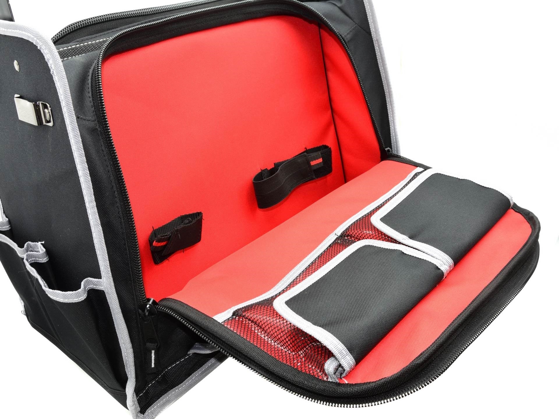- Două compartimente laterale echipate cu 42 de buzunare și mânere