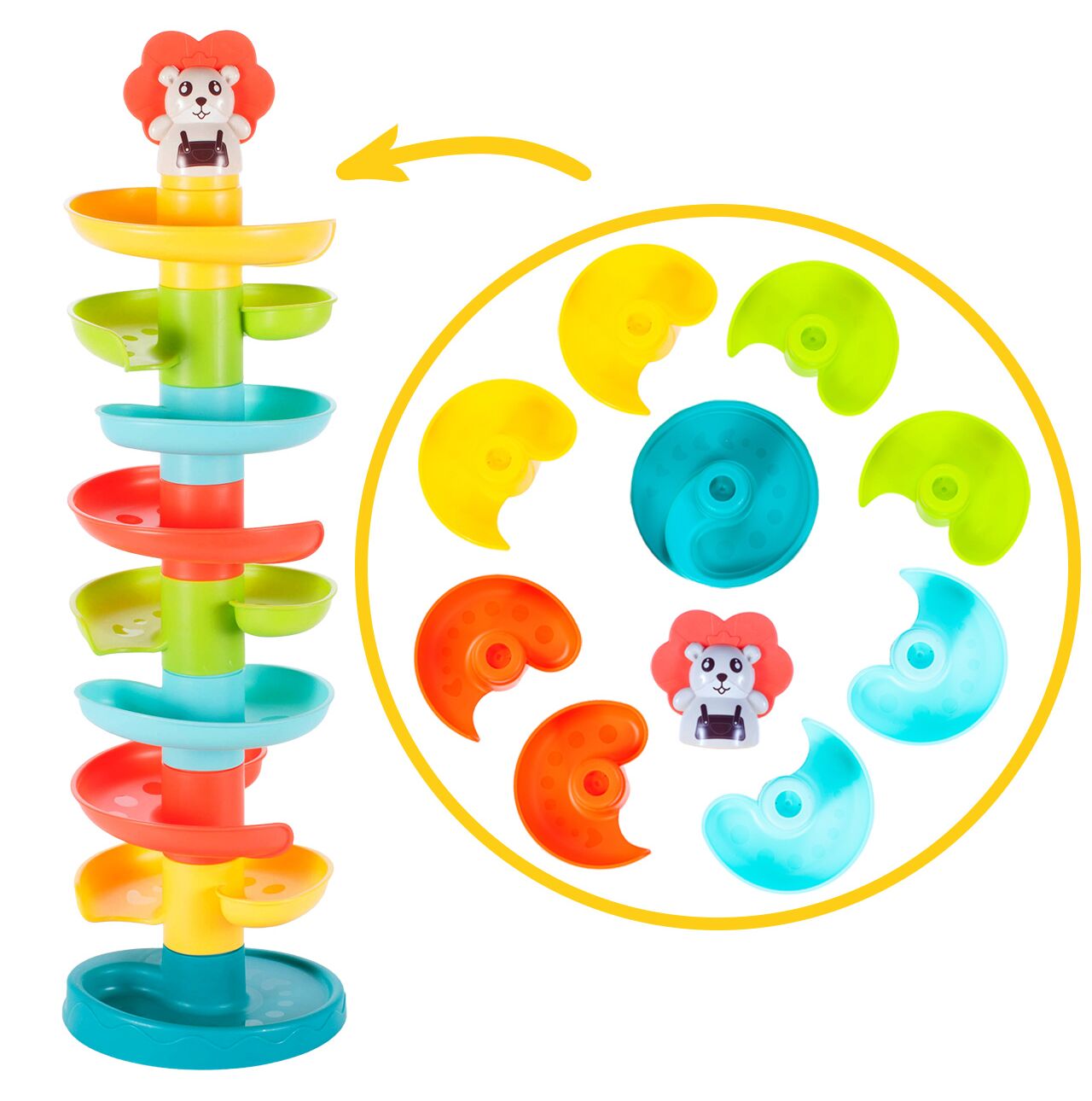 Bilele nu numai ca se rostogolesc in jos pe turn, dar si zornaie pe masura ce cad, sporind si mai mult distractia. Sunetul zornaitor stimuleaza auzul copilului si il incurajeaza sa puna bilele inapoi in varf, dezvoltandu-si coordonarea si abilitatile manuale.
