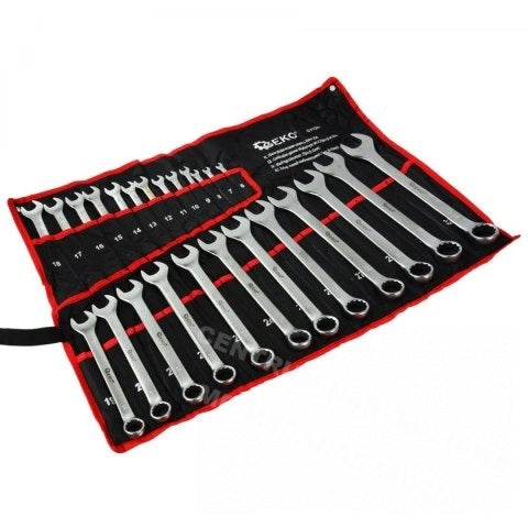 Set de 25 de chei combinate șlefuite. Cheile sunt realizate din oțel cromat de vanadiu (CrV). Cheile sunt plasate într-o foaie durabilă, cu închidere Velcro și posibilitatea de a atârna pe perete.