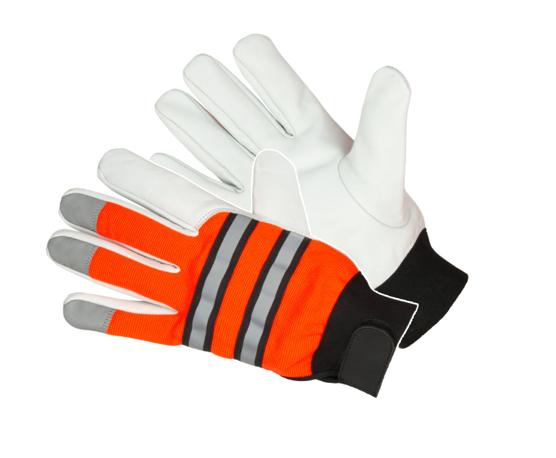 Manusi de protectie , intarite cu piele integrala de inalta rezistenta, care imbunatateste dexteritatea. Partea din spate este tricotata flexibil, de culoare portocalie fluorescenta, cu banda reflectorizanta pe degete si o chinga din poliester cu banda reflectorizanta pe incheieturi. Mansete elastice cu inchidere reglabila cu velcro.