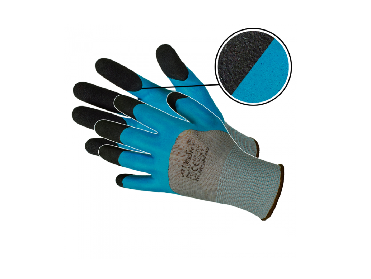 Acoperit cu latex spumat cu o textura neteda in albastru pe 3/4 din manusa,