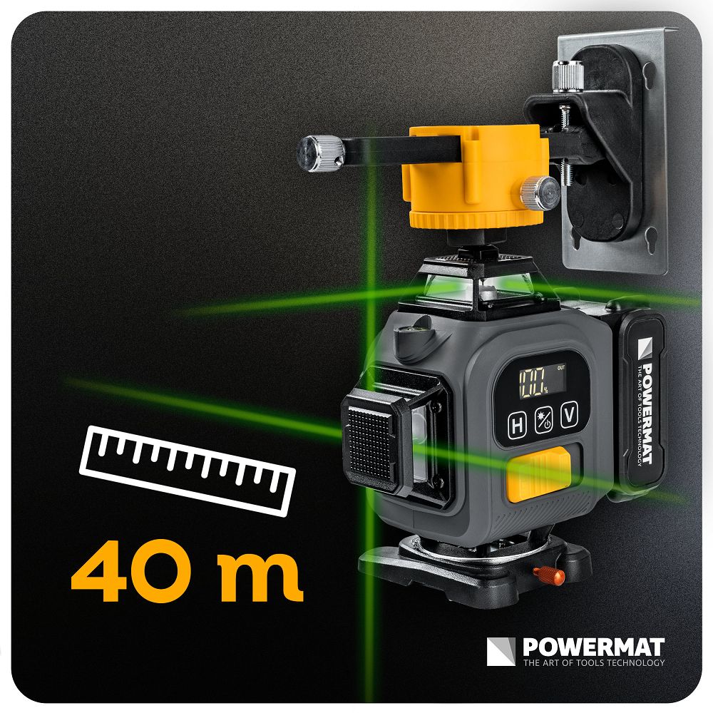 Laserul verde si raza de actiune de 40 m faciliteaza vizualizarea si lucrul fara a fi nevoie de presupuneri.