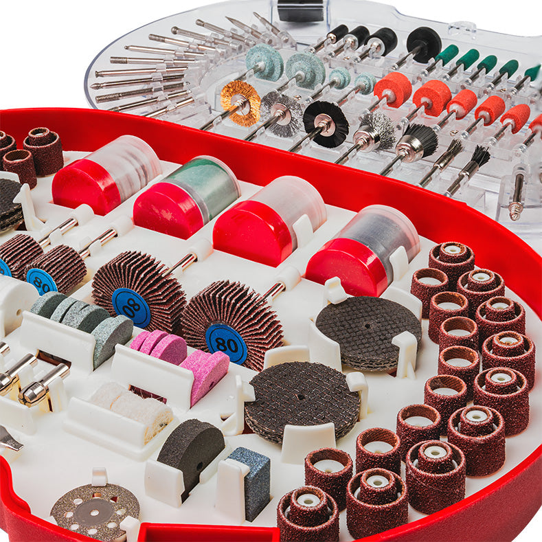 Setul de 227 de accesorii este completarea perfecta pentru orice unealta rotativa, oferind o gama larga de aplicatii – de la slefuire fina si gravare pana la taiere, lustruire si gaurire