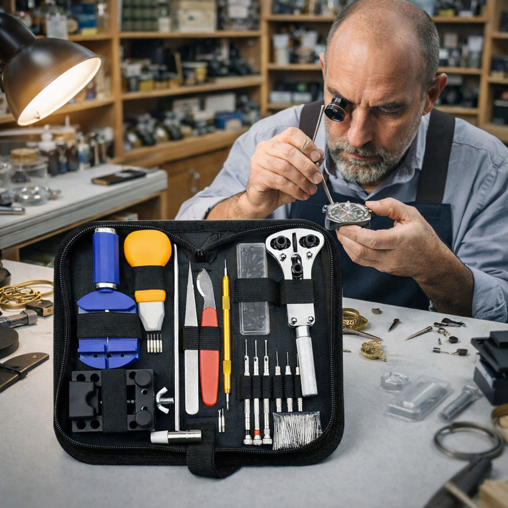 Trusa profesionala de reparare a ceasurilor este un set complet de instrumente concepute pentru operarea, repararea si intretinerea precisa a ceasurilor mecanice si cu cuart. A fost creata pentru cei care doresc sa efectueze acasa sarcini de baza si mai avansate de fabricatie a ceasurilor, fara a fi nevoie de un atelier de reparatii.