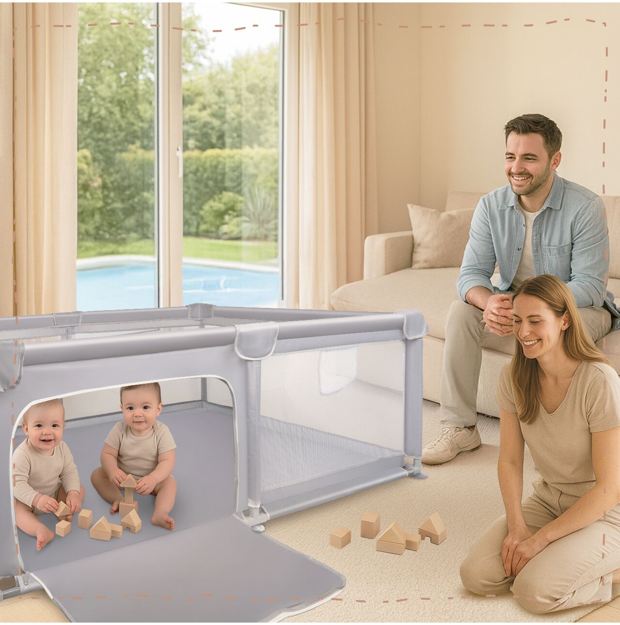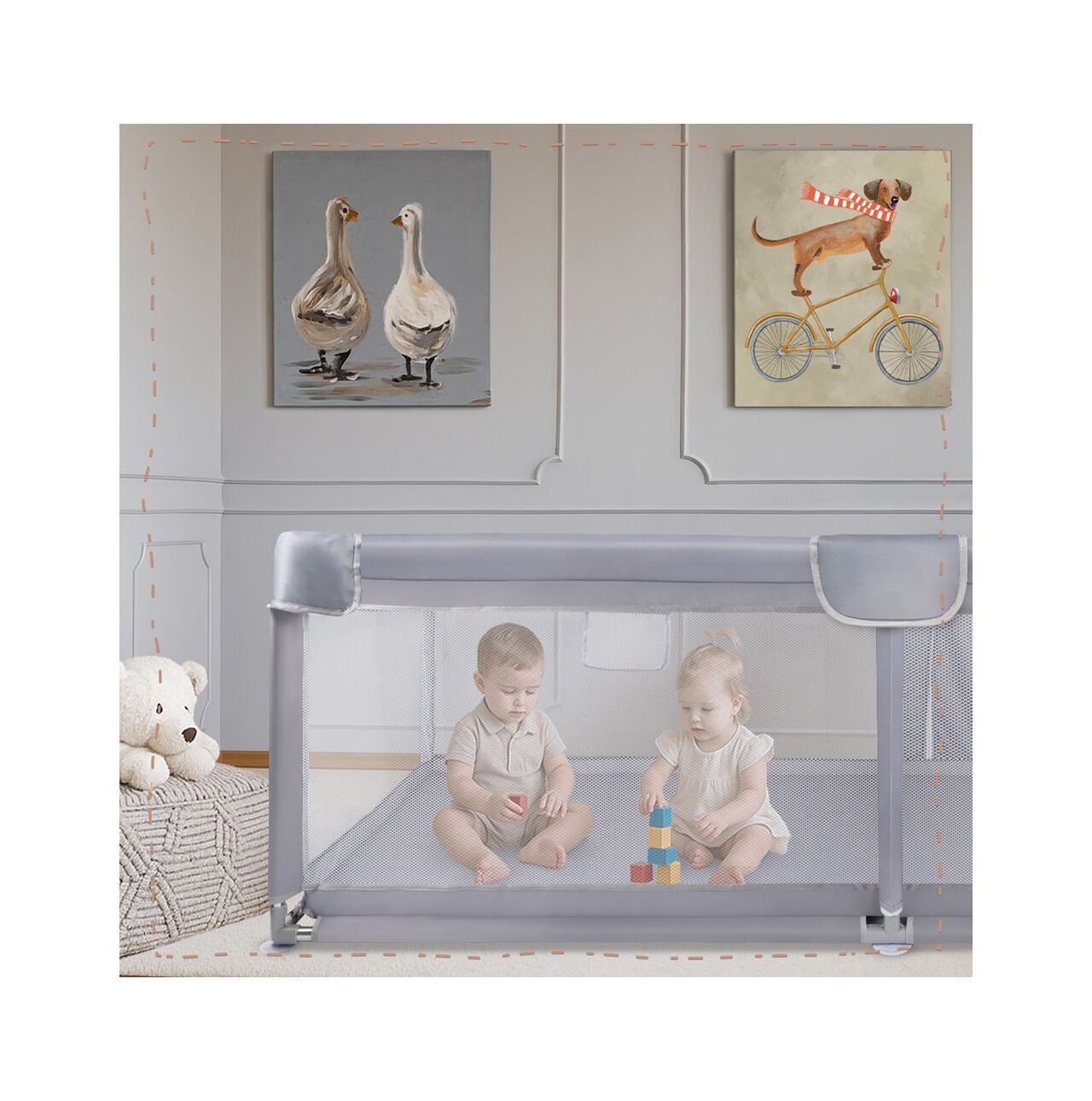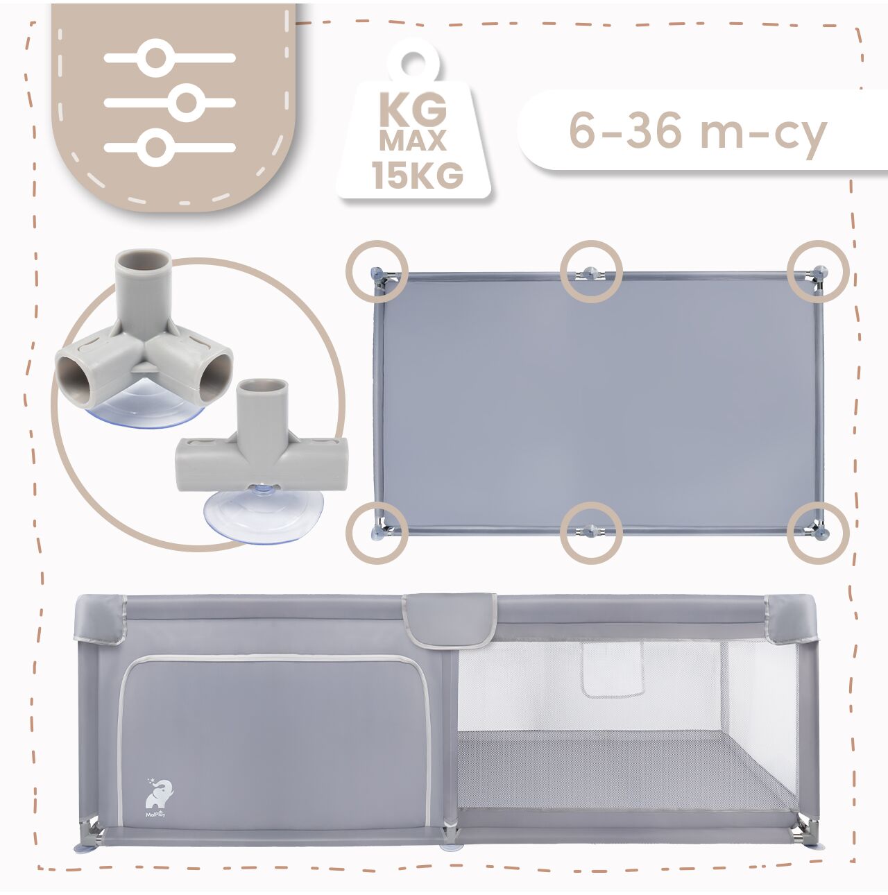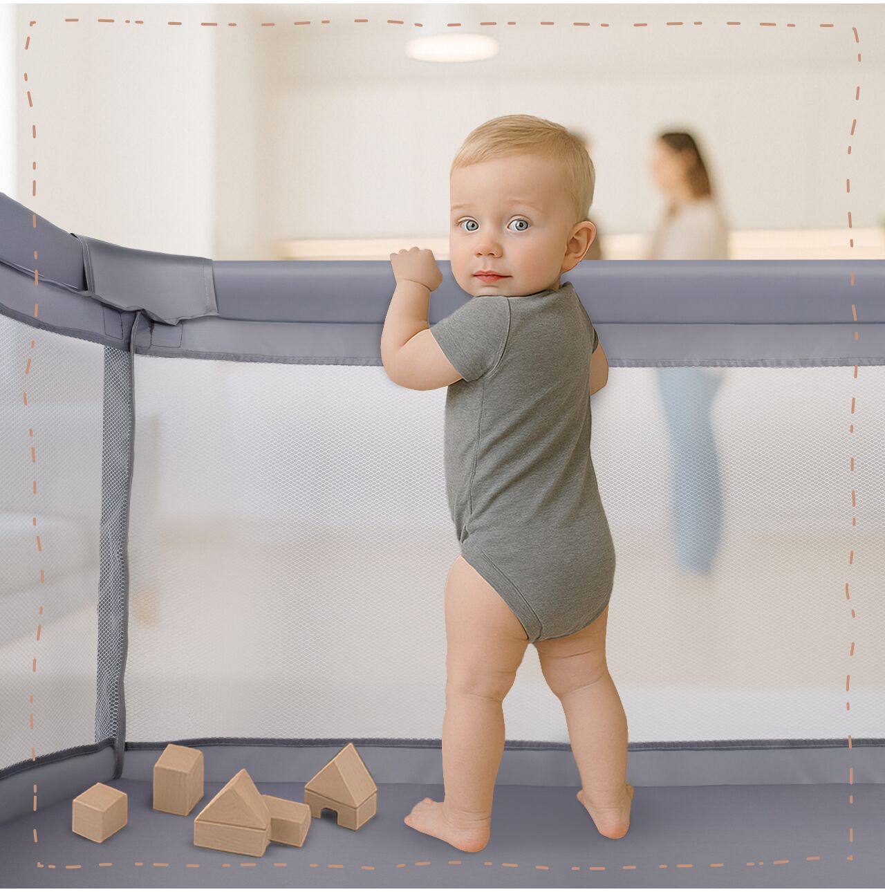 Tarcul nostru este un spatiu spatios si sigur pentru copilul dumneavoastra – perfect pentru joaca, invatarea tararii, primele incercari de a sta in picioare si explorare independenta. Datorita intrarii cu fermoar, actionata exclusiv din exterior, parintii au control deplin asupra accesului in tarc . Copiii mai mari pot intra si iesi independent cu permisiunea ingrijitorului , sprijinind dezvoltarea independentei si construind un sentiment de securitate.
