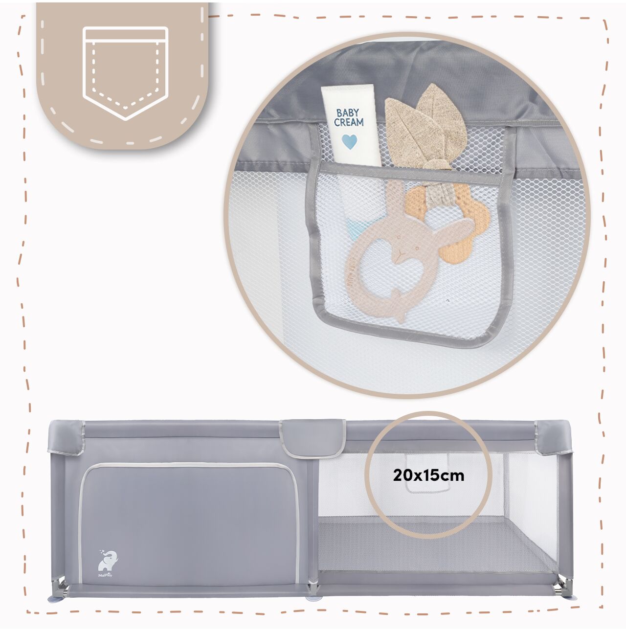 Tarcul de joaca KIVO are un buzunar practic din plasa pe unul dintre peretii laterali. Materialul transparent va permite sa vedeti cu usurinta continutul buzunarului, permitand acces rapid la obiecte esentiale precum crema pentru bebelusi, jucarii de dentitie sau jucarii mici. Aceasta solutie convenabila va ajuta sa ramaneti organizati si sa aveti toate lucrurile esentiale mereu la indemana.