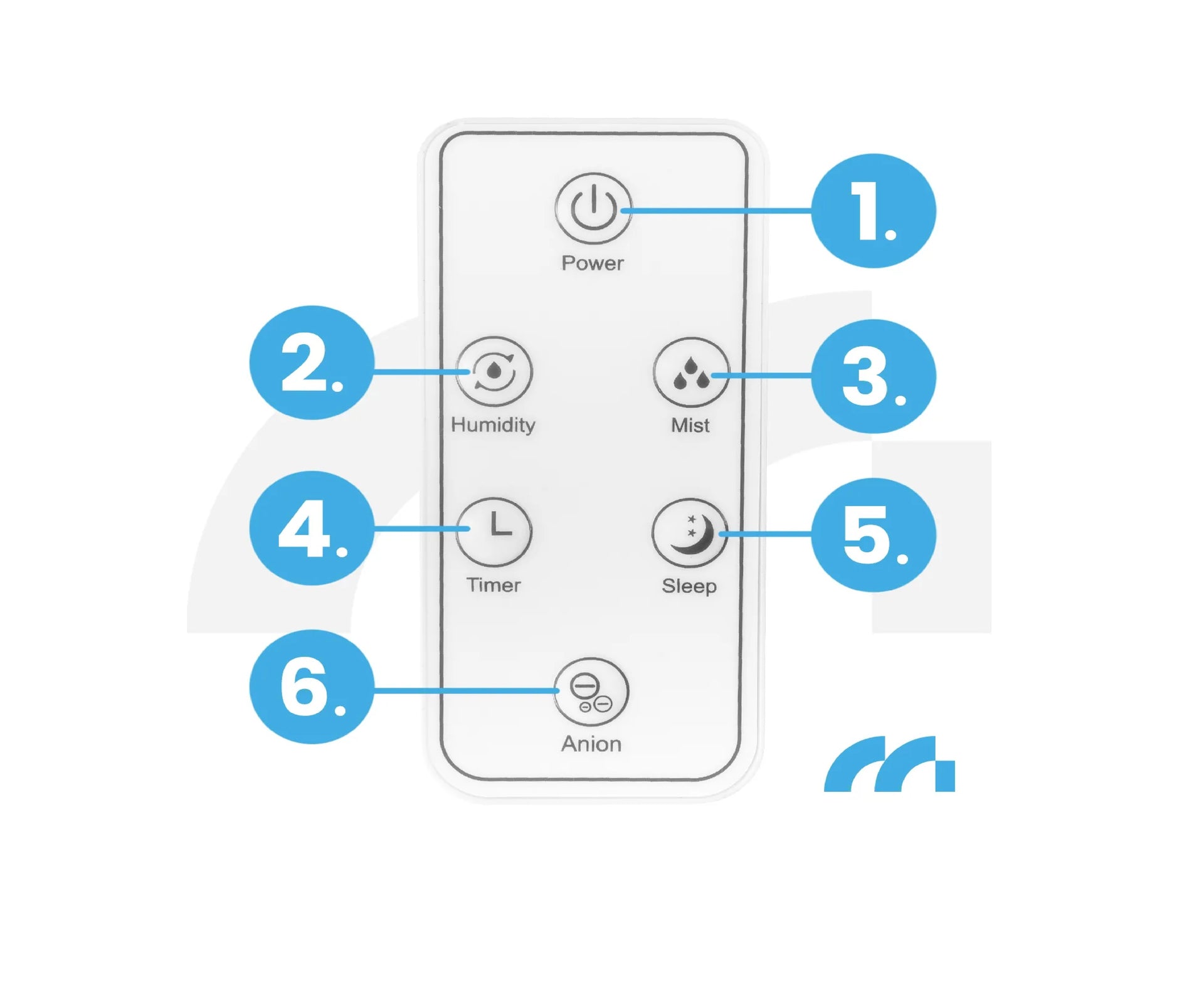 Umidificatorul este echipat cu o telecomanda care permite functionarea completa a dispozitivului fara a fi nevoie sa va apropiati de panou.